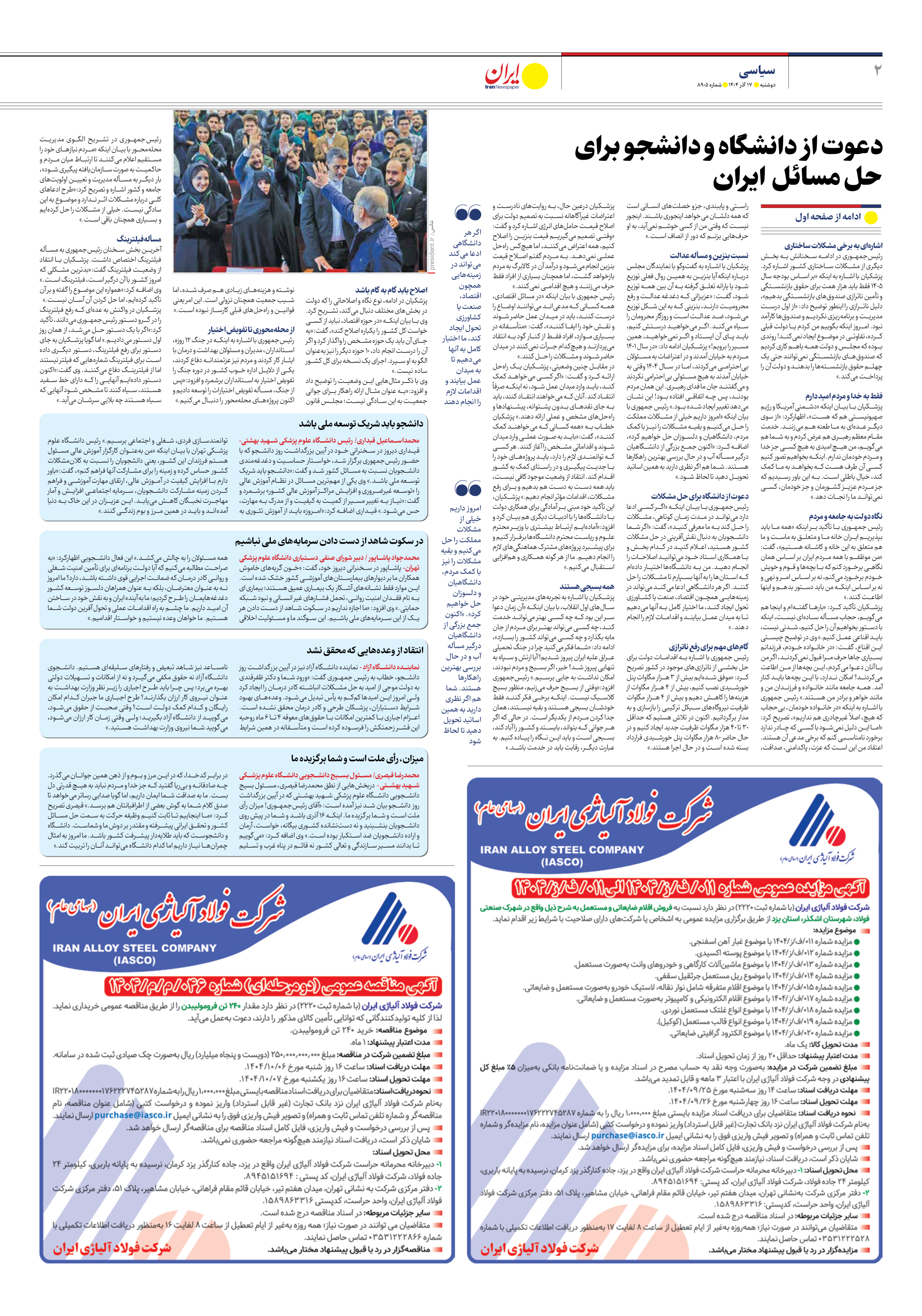 رئیسجمهوری با بیان اینکه «اگر کسی ادعا دارد میتواند در مدت زمان کوتاهی، مشکلات را حل کند به ما معرفی کنید»، گفت: «اگر شما دانشجویان به دنبال نقشآفرینی در حل مشکلات کشور هستید، اعلام کنید در کدام بخش و با همکاری استاد خود میتوانید اصلاحات را انجام دهید. من به دانشگاهها اختیار دادهام که استانها را به آنها بسپارم تا مشکلات را حل کنند. اگر هر دانشگاهی ادعا میکند میتواند در زمینههایی همچون اقتصاد، صنعت یا کشاورزی تحول ایجاد کند، ما اختیار کامل به آنها میدهیم تا به میدان عمل بیایند و اقدامات لازم را انجام دهند.»