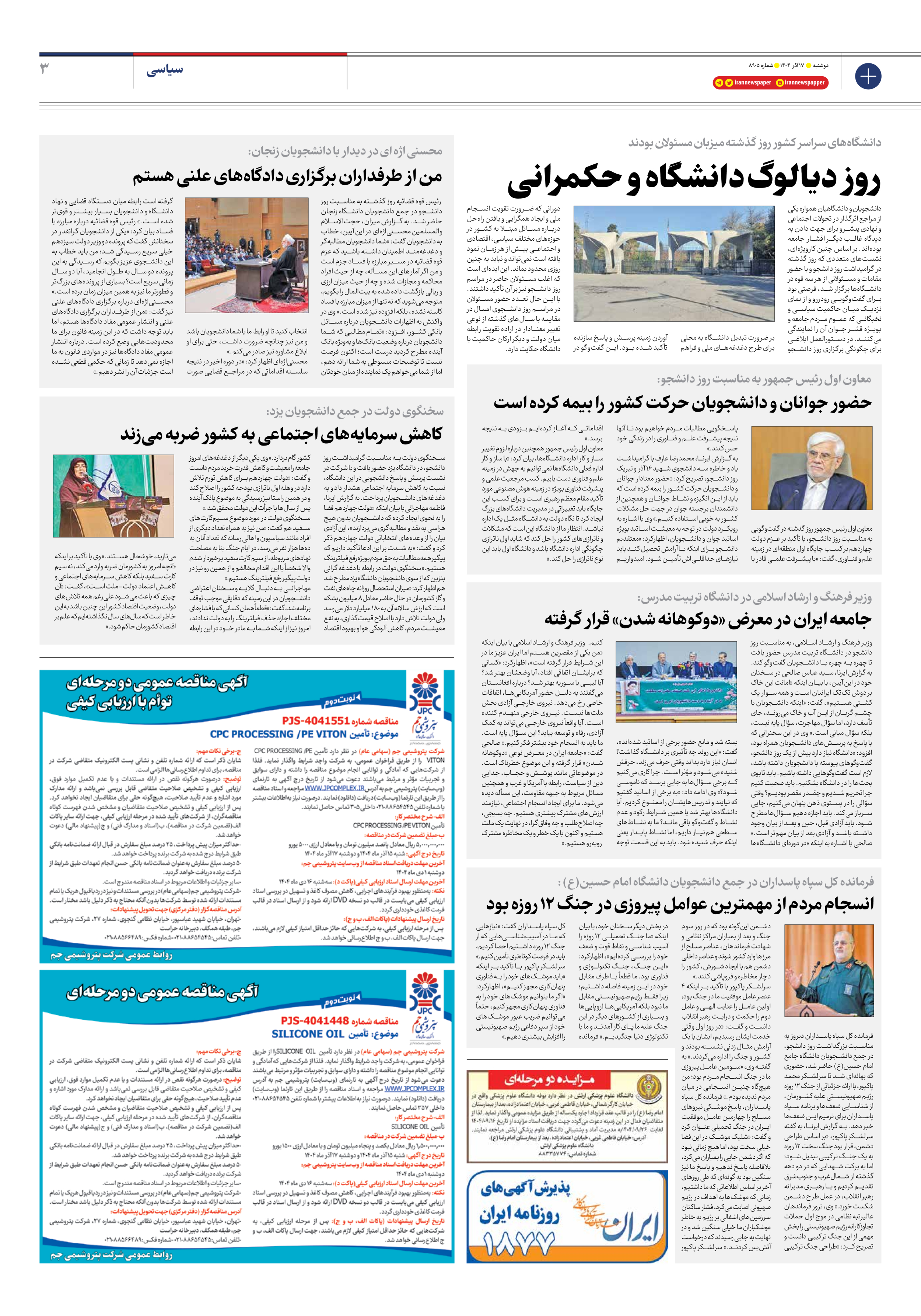 سخنگوی دولت به مناسبت گرامیداشت روز دانشجو، در دانشگاه یزد حضور یافت و با شرکت در نشست پرسش و پاسخ دانشجویی در این دانشگاه، نسبت به کاهش سرمایه اجتماعی هشدار داد و به دغدغههای دانشجویان پرداخت. به گزارش ایرنا، فاطمه مهاجرانی با بیان اینکه «دولت چهاردهم فضا را به نحوی ایجاد کرده که دانشجویان بدون هیچ هراسی به نقد و مطالبهگری میپردازند»، این آزادی بیان را از وعدههای انتخاباتی دولت چهاردهم ذکر کرد و گفت: «به شدت بر این ادعا تأکید داریم که پیگیر همه مطالبات به حق مردم بویژه رفع فیلترینگ هستیم.» سخنگوی دولت در رابطه با دغدغه گرانی بنزین که از سوی دانشجویان دانشگاه یزد مطرح شد هم اظهار کرد: «میزان استحصال روزانه چاههای نفت و گاز کشورمان در حال حاضر معادل 8 میلیون بشکه است که ارزش سالانه آن به ۱۸۰ میلیارد دلار میرسد ولی دولت تلاش دارد با اصلاح قیمتگذاری، به نفع معیشت مردم، کاهش آلودگی هوا و بهبود اقتصاد کشور گام بردارد.» وی یکی دیگر از دغدغههای امروز جامعه را معیشت و کاهش قدرت خرید مردم دانست و گفت: «دولت چهاردهم برای کاهش تورم تلاش دارد در وهله اول ناترازی بودجه کشور را اصلاح کند و در همین راستا نیز رسیدگی به موضوع بانک آینده پس از سالها با جرأت این دولت محقق شد.»