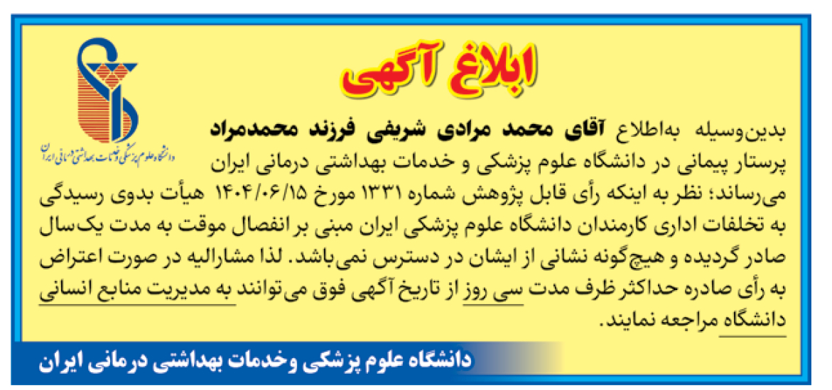 بدینوسیله بهاطلاع آقای محمد مرادی شریفی فرزند محمدمراد پرستار پیمانی در دانشگاه علوم پزشکی و خدمات بهداشتی درمانی ایران میرساند؛ نظر به اینکه رأی قابل پژوهش شماره 1331 مورخ 1404/06/15 هیأت بدوی رسیدگی به تخلفات اداری کارمندان دانشگاه علوم پزشکی ایران مبنی بر انفصال موقت به مدت یکسال صادر گردیده و هیچگونه نشانی از ایشان در دسترس نمیباشد. لذا مشارالیه در صورت اعتراض به رأی صادره حداکثر ظرف مدت سی روز از تاریخ آگهی فوق میتوانند به مدیریت منابع انسانی دانشگاه مراجعه نمایند.