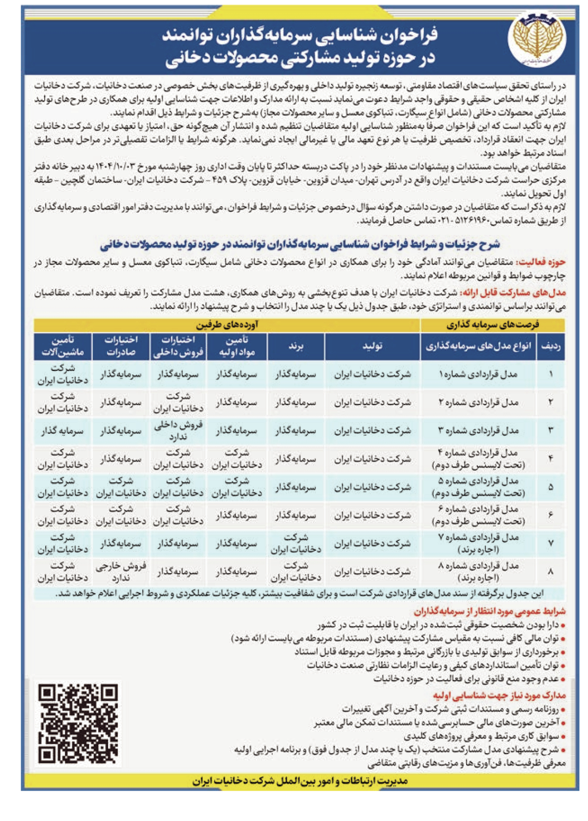 لازم به تأکید است که این فراخوان صرفاً بهمنظور شناسایی اولیه متقاضیان تنظیم شده و انتشار آن هیچگونه حق، امتیاز یا تعهدی برای شرکت دخانیات ایران جهت انعقاد قرارداد، تخصیص ظرفیت یا هر نوع تعهد مالی یا غیرمالی ایجاد نمینماید. هرگونه شرایط یا الزامات تفصیلیتر در مراحل بعدی طبق اسناد مرتبط خواهد بود.