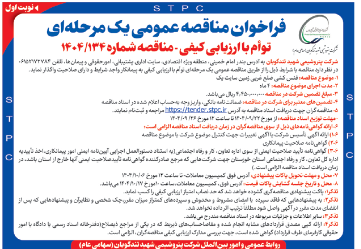 فراخوان مناقصه عمومی یک مرحلهای توأم با ارزیابی کیفی - مناقصه شماره ۱۳۴/۱۴۰۴