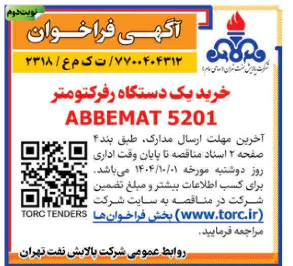 برای کسب اطلاعات بیشتر و مبلغ تضمین شــــرکت در منـــاقصـــه به ســـایت شــرکت (www.torc.ir) بخش فراخــوانهــا مراجعه فرمایید.