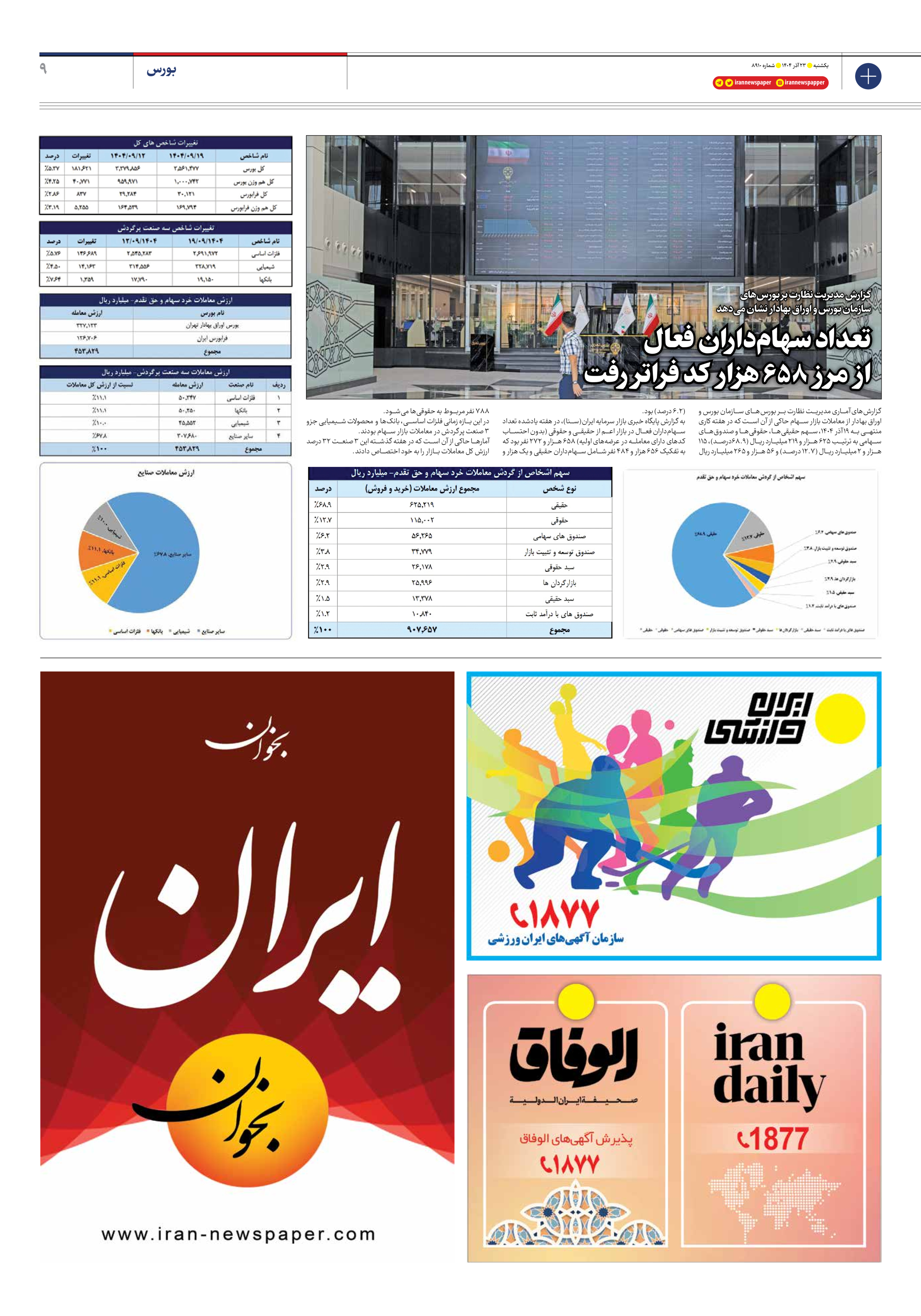 گزارشهای آماری مدیریت نظارت بر بورسهای سازمان بورس و اوراق بهادار از معاملات بازار سهام حاکی از آن است که در هفته کاری منتهی به ۱۹ آذر ۱۴۰۴، سهم حقیقیها، حقوقیها و صندوقهای سهامی به ترتیب ۶۲۵ هزار و ۲۱۹ میلیارد ریال (۶۸.۹درصد)، ۱۱۵ هزار و ۲ میلیارد ریال (۱۲.۷ درصد) و ۵۶ هزار و ۲۶۵ میلیارد ریال