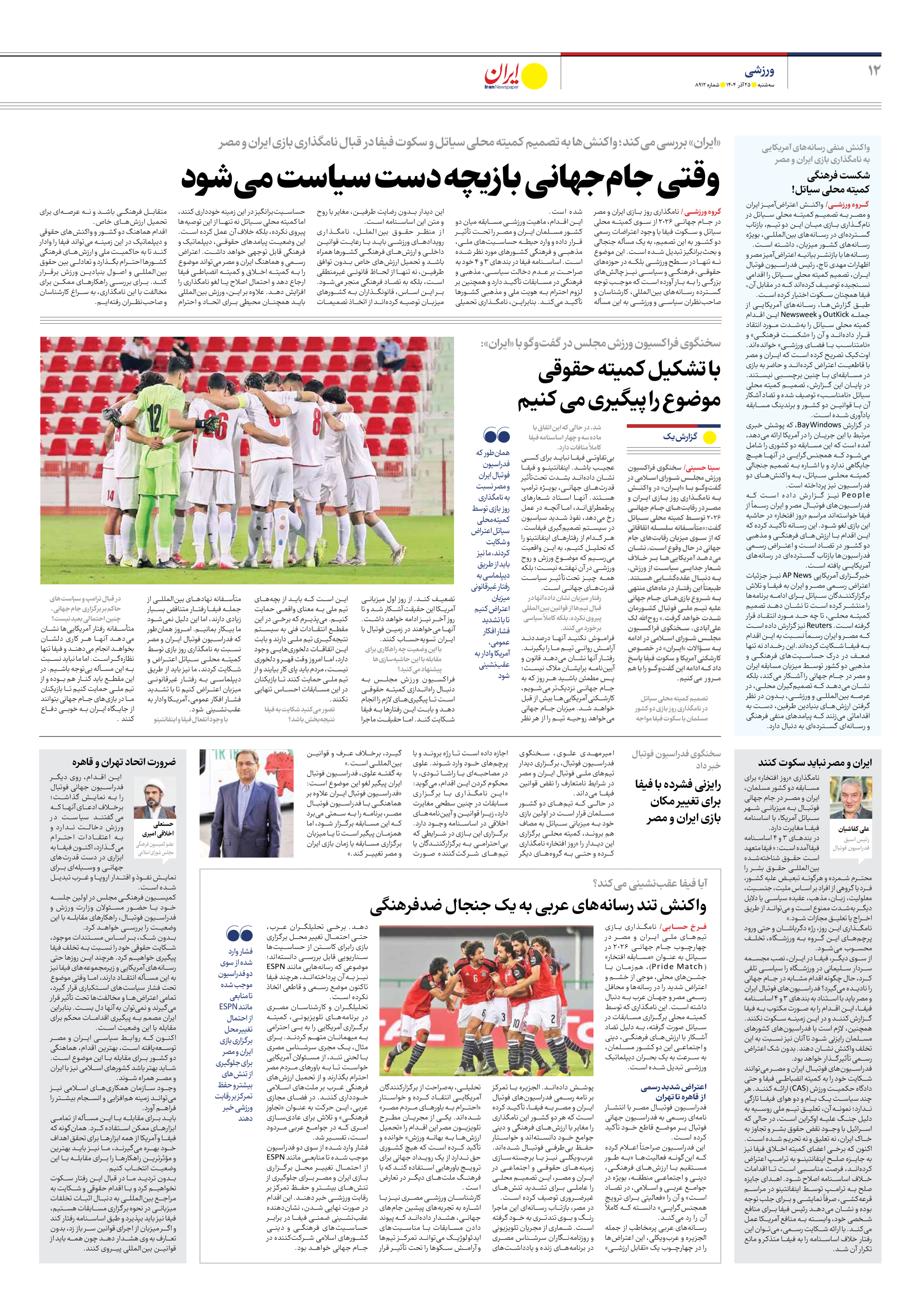 کارشناسان ورزشی مصری نیز با اشاره به تجربههای پیشین جامهای جهانی، هشدار دادهاند که پیوند دادن مسابقات با مناسبتهای ایدئولوژیک میتواند تمرکز تیمها و آرامش سکوها را تحت تأثیر قرار دهد. برخی تحلیلگران عرب، حتی احتمال تغییر محل برگزاری بازی رابرای کاستن از حساسیتها سناریویی قابل بررسی دانستهاند؛ موضوعی که رسانههایی مانند ESPN نیز به آن پرداختهاند، هرچند فیفا تاکنون موضع رسمی و قاطعی اتخاذ نکرده است.
