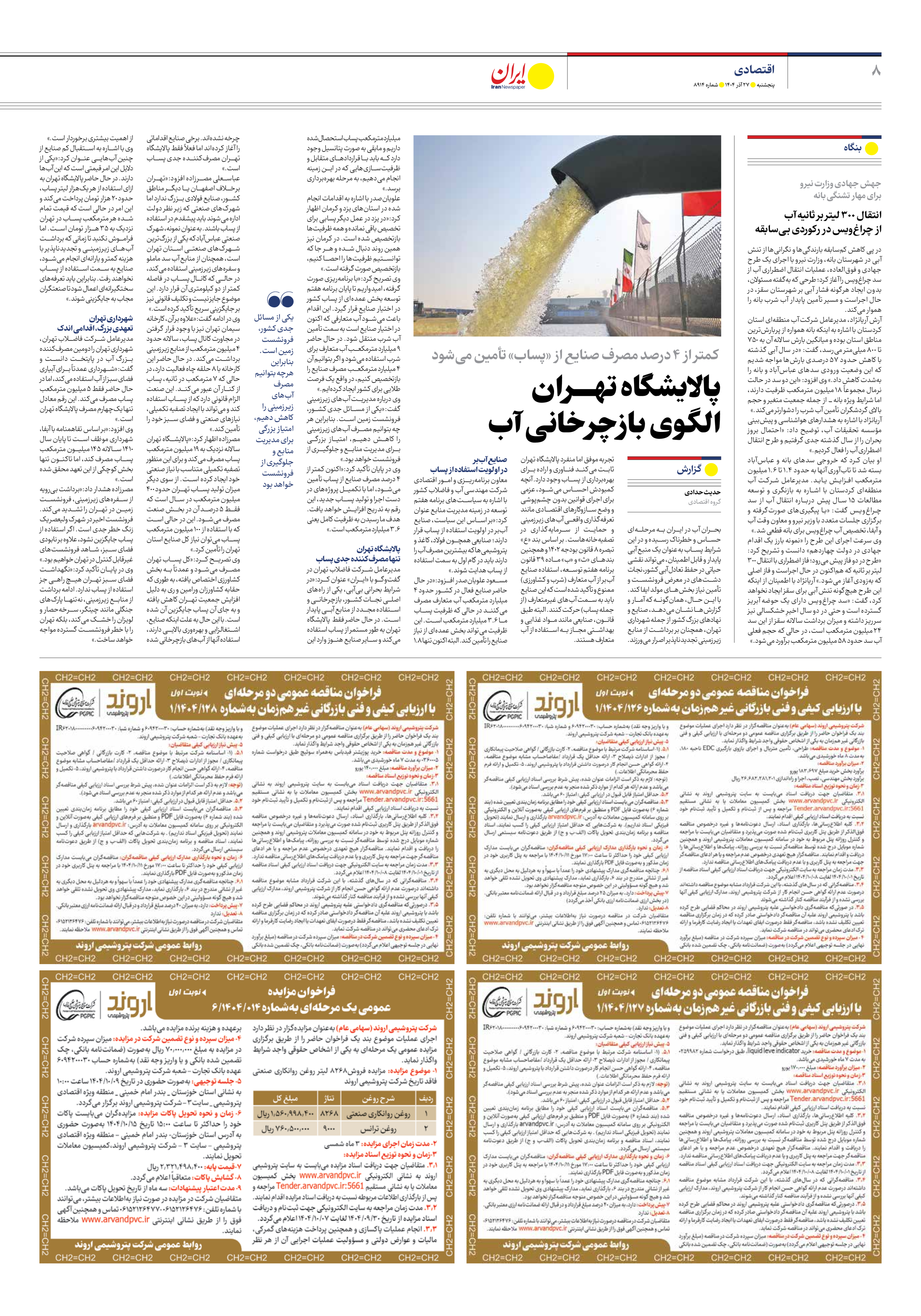 مدیرعامل شرکت فاضلاب تهران در گفتوگو با «ایران» عنوان کرد:«در شرایط بحرانی بیآبی، یکی از راههای اصلی نجات کشور، بازچرخانی و استفاده مجدد از منابع آبی پایدار است. در حال حاضر فقط پالایشگاه تهران به طور مستمر از پساب استفاده میکند و سایر صنایع هنوز وارد این چرخه نشدهاند. برخی صنایع اقداماتی را آغاز کردهاند اما فعلاً فقط پالایشگاه تهران مصرفکننده جدی پساب است.»