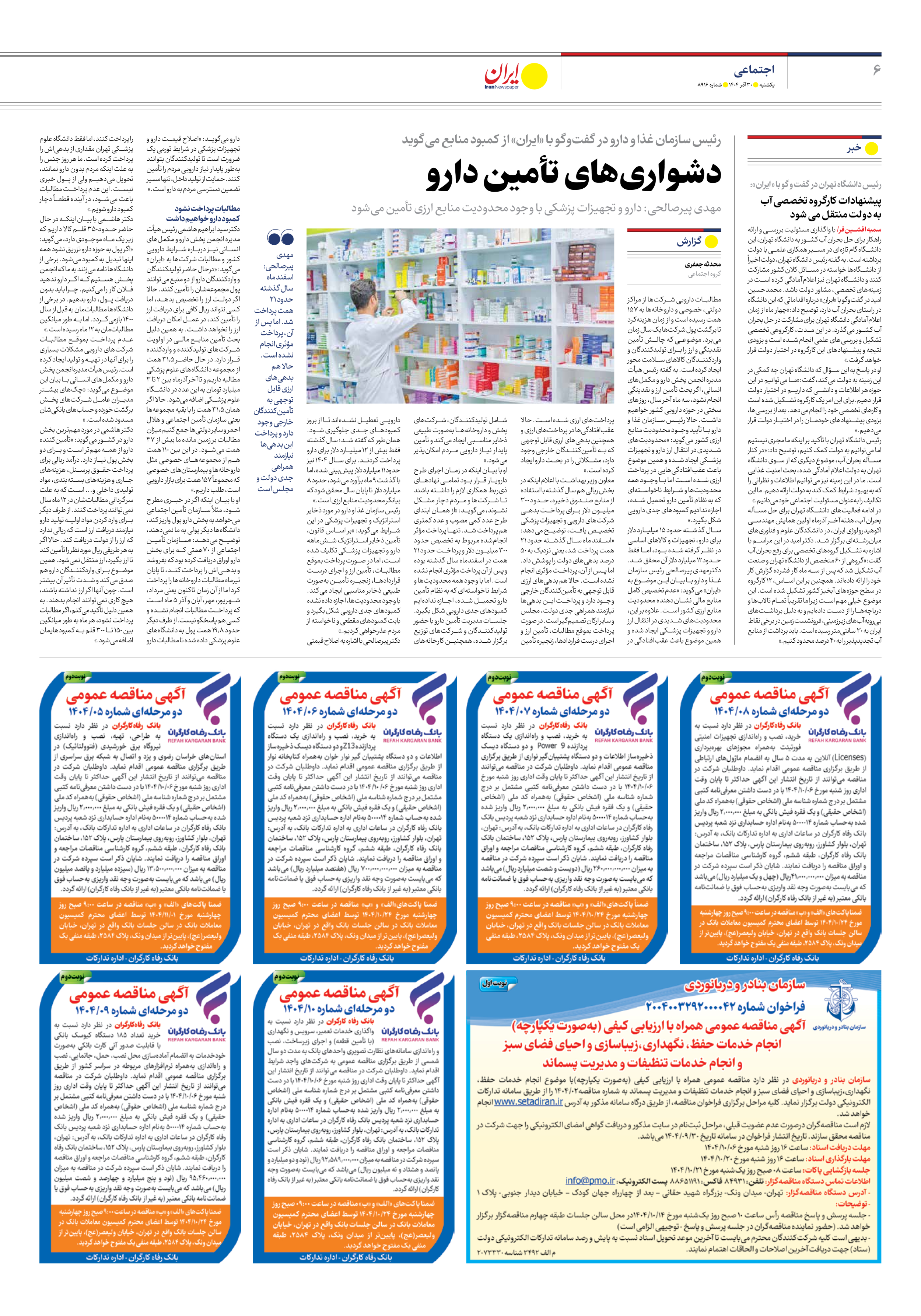 او با بیان اینکه اگر در خبری مطرح شود، مثلاً سازمان تأمین اجتماعی میخواهد به بخش دارو پول واریز کند، دانشگاهها دیگر پولی به ما نمیدهند، توضیح میدهد: «سازمان تأمین اجتماعی از 70همتی که برای بخش دارو اوراق دریافت کرده بود که بفروشد و بدهیاش را پرداخت کند، تا پایان تیرماه مطالبات داروخانهها را پرداخت کرد اما از آن زمان تاکنون یعنی مرداد، شهریور، مهر، آبان و آذر 5 ماه است که پرداخت مطالبات انجام نشده و کسی هم پاسخگو نیست. از طرف دیگر حدود 19.8 همت پول به دانشگاههای علوم پزشکی داده شده تا مطالبات دارو را پرداخت کنند، اما فقط دانشگاه علوم پزشکی تهران مقداری از بدهیاش را پرداخت کرده است. ما هر روز جنس را به علت اینکه مردم بدون دارو نمانند، تحویل میدهیم ولی از پول خبری نیست. این عدم پرداخت مطالبات باعث میشود، در آینده قطعاً دچار کمبود دارو شویم.»