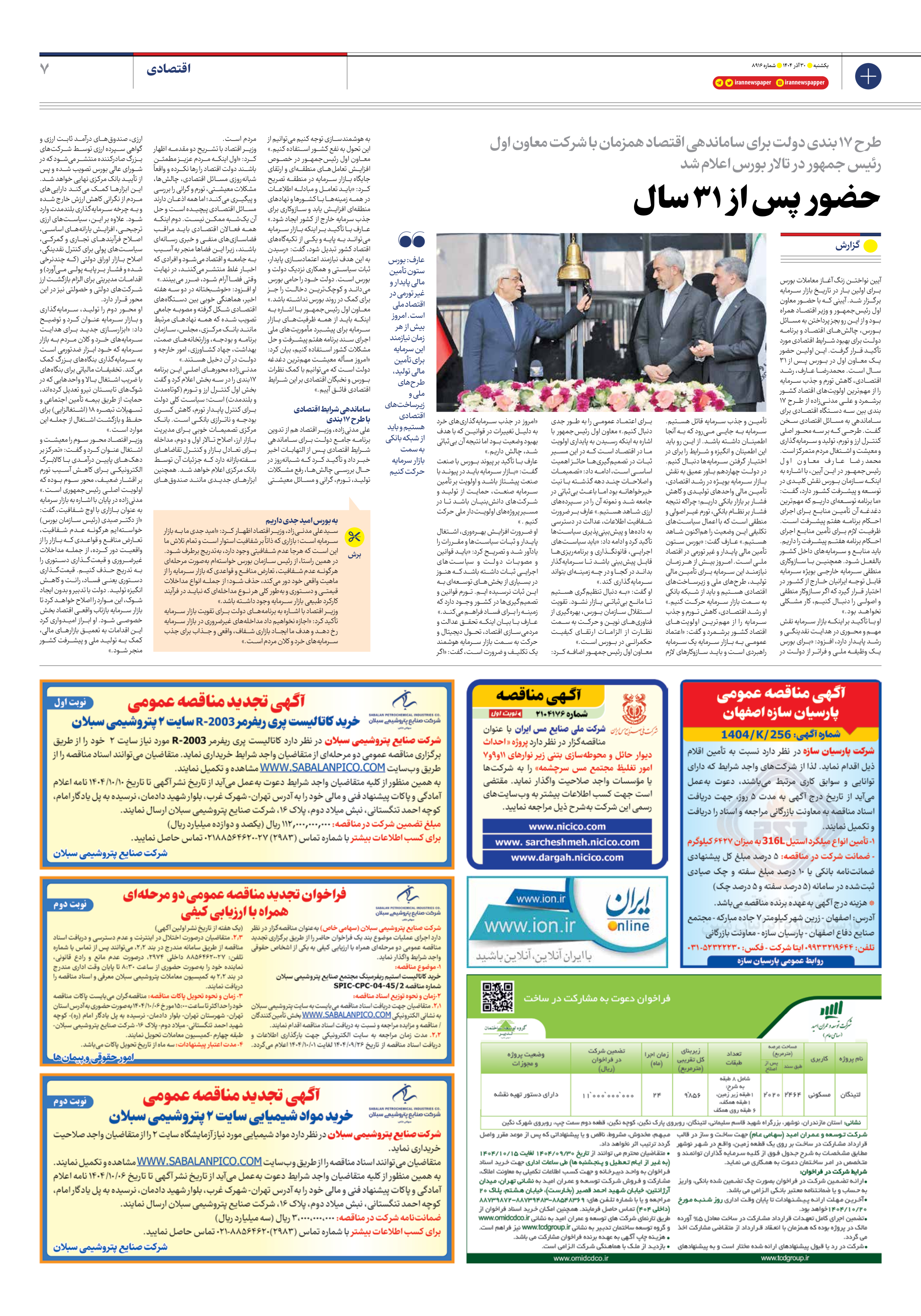 آیین نواختن زنگ آغاز معاملات بورس برای اولین بار در تاریخ بازار سرمایه برگزار شد. آیینی که با حضور معاون اول رئیسجمهور و وزیر اقتصاد همراه بود و از این رو بجز پرداختن به مسائل بورس، چالشهای اقتصاد و برنامه دولت برای بهبود شرایط اقتصادی مورد تأکید قرار گرفت. این اولین حضور یک معاون اول در بورس پس از 31 سال است. محمدرضا عارف، رشد اقتصادی، کاهش تورم و جذب سرمایه را از مهمترین اولویتهای اقتصاد کشور برشمرد و علی مدنیزاده از طرح 17 بندی بین سه دستگاه اقتصادی برای ساماندهی به مسائل اقتصادی سخن گفت. طرحی که بر سه محور اصلی کنترل ارز و تورم، تولید و سرمایهگذاری و معیشت و اشتغال مردم متمرکز است.