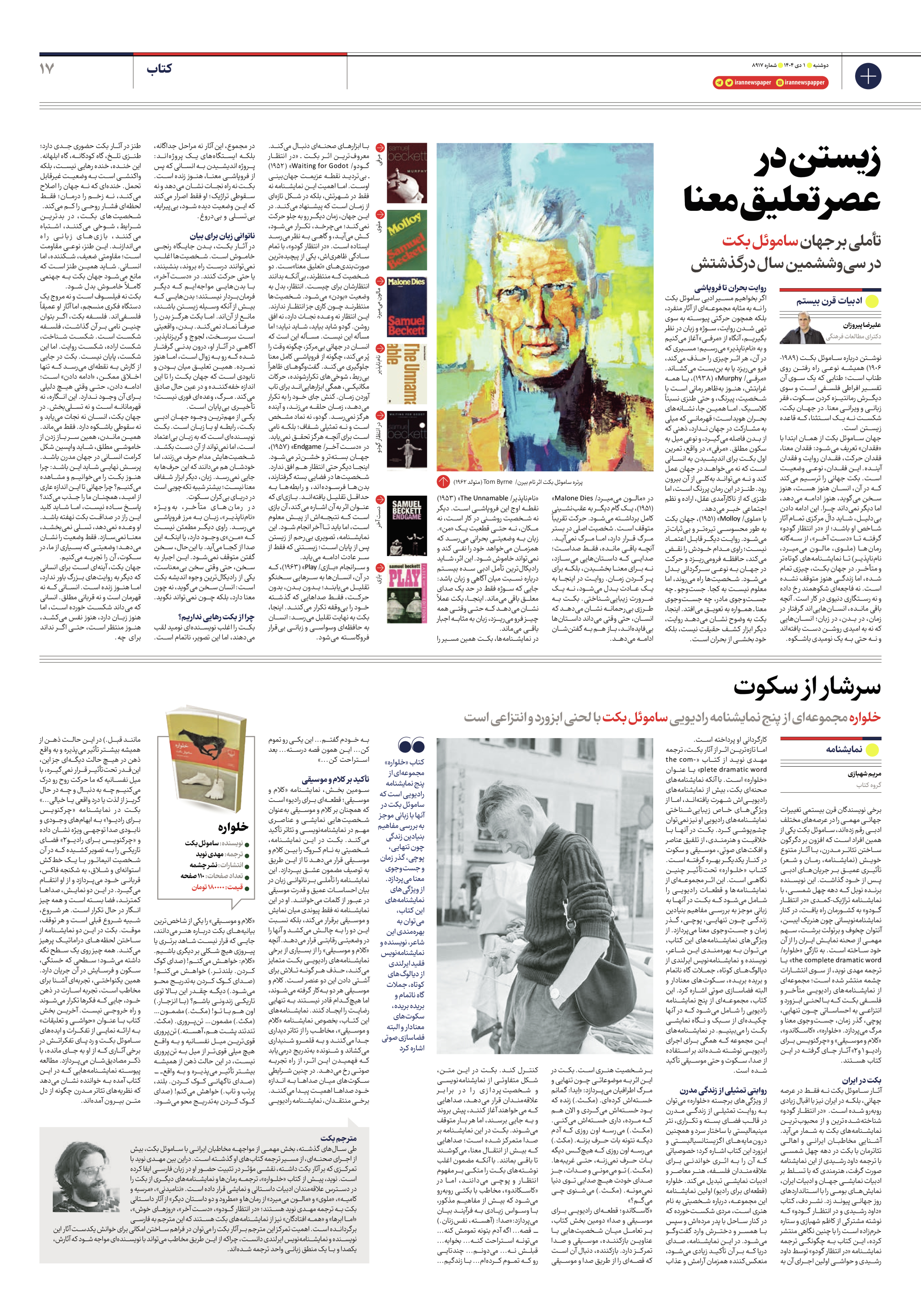برخی نویسندگان قرن بیستمی تغییرات جهانی مهمی را در عرصههای مختلف ادبی رقم زدهاند، ساموئل بکت یکی از همین افراد است که افزون بر دگرگون ساختن تئاتر مدرن، با آثار متنوع خویش (نمایشنامه، رمان و شعر) تأثیری عمیق بر جریانهای ادبی پس از خود گذاشت. این نویسنده برنده نوبل که دهه چهل شمسی، با نمایشنامه تراژیک-کمدی «در انتظار گودو» به کشورمان راه یافت، در کنار نمایشنامهنویسانی چون هنریک ایبسن، آنتوان چخوف و برتولت برشت، سهم مهمی از صحنه نمایش ایران را از آن خود ساخته است. به تازگی «خلواره/ the complete dramatic word» با ترجمه مهدی نوید، از سوی انتشارات چشمه منتشر شده است؛ مجموعهای از نمایشنامههای رادیویی متأخر و فلسفی بکت که با لحنی ابزورد و انتزاعی به احساساتی چون تنهایی، پوچی، گذر زمان، جستوجوی معنا و مرگ میپردازد. «خلواره»، «کاسکاندو»، «کلام و موسیقی» و «چرکنویس برای رادیو ۱ و۲» آثار جای گرفته در این کتاب هستند.