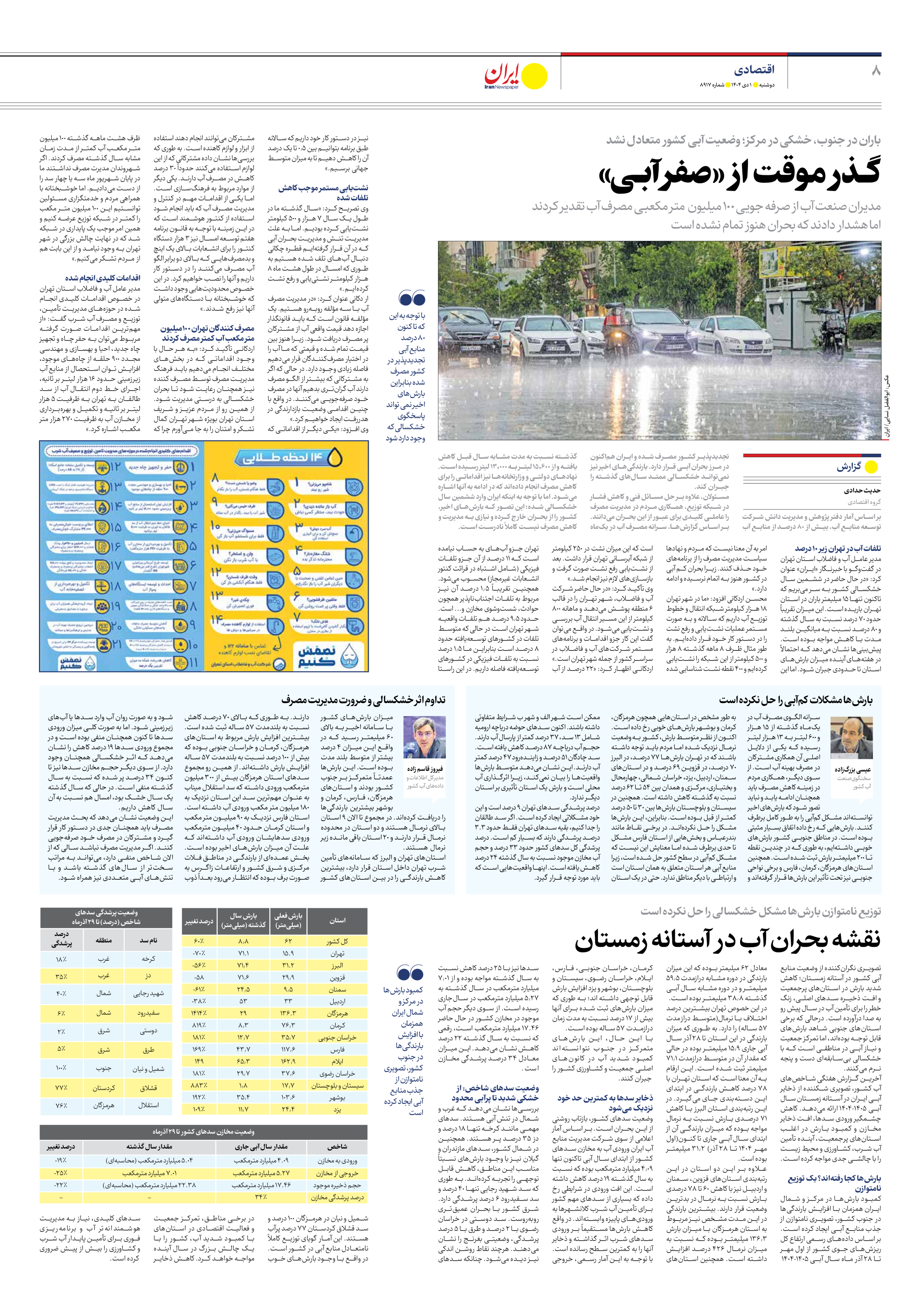 استان فارس نزدیک به ۹۰ میلیون متر مکعب و استان کرمان حدود ۴۰ میلیون مترمکعب ورودی سدهایشان ورودی آب داشتهاند که علت آن میزان بارشهای اخیر بوده است. بخش عمدهای از بارندگی در مناطق فلات مرکزی و شرق کشور و ارتفاعات زاگرس به صورت برف بوده که انتظار میرود بعداً ذوب شود و به صورت روان آب وارد سدها یا آبهای زیرزمینی شود. اما به صورت کلی میزان ورودی سدها تا کنون همچنان منفی بوده است و در مجموع ورودی سدها ۱۹ درصد کاهش را نشان میدهد که اثر خشکسالی همچنان وجود دارد. از سوی دیگر حجم مخازن سدها نیز تا کنون ۳۴ درصد پر شده که نسبت به سال گذشته منفی است. در حالی که سال گذشته یک سال خشک بود، امسال هم نسبت به آن سال کاهش داریم.