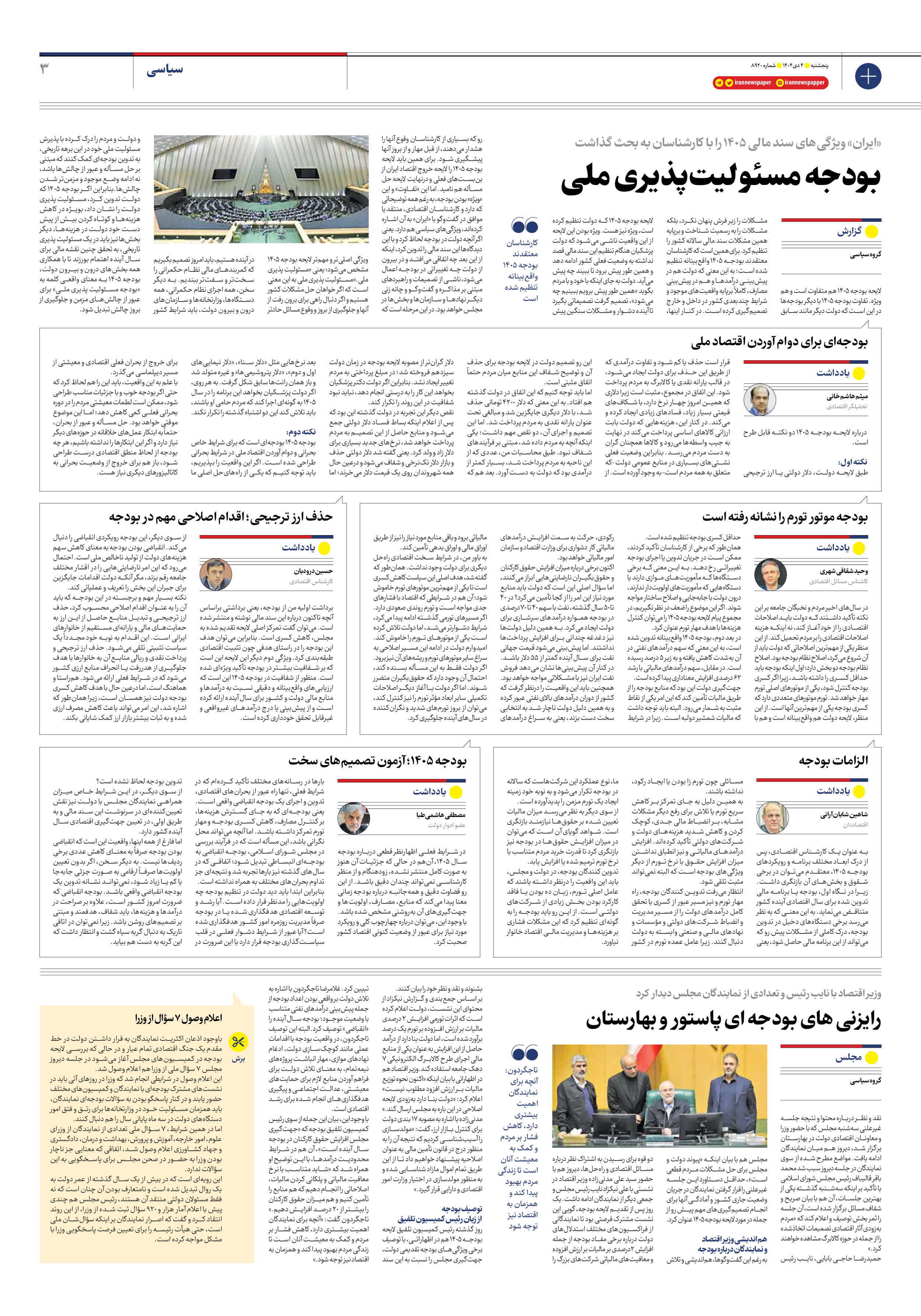 لایحه بودجه 1405 هم متفاوت است و هم ویژه. تفاوت بودجه 1405 با دیگر بودجهها در این است که دولت دیگر مانند سابق مشکلات را زیر فرش پنهان نکرد، بلکه مشکلات را به رسمیت شناخت و برپایه همین مشکلات سند مالی سالانه کشور را تنظیم کرد. برای همین است که کارشناسان معتقدند بودجه 1405 واقعبینانه تنظیم شده است؛ به این معنی که دولت هم در پیشبینی درآمدها و هم در پیشبینی مصارف، کاملاً برپایه واقعیتهای موجود و شرایط چندبعدی کشور در داخل و خارج تصمیمگیری کرده است. در کنار اینها، لایحه بودجه 1405 که دولت تنظیم کرده است، ویژه نیز هست. ویژه بودن این لایحه از این واقعیت ناشی میشود که دولت پزشکیان هنگام تنظیم این سند مالی قصد نداشته به وضعیت فعلی کشور ادامه دهد و همین طور پیش برود تا ببیند چه پیش میآید. دولت به جای اینکه با خود و با مردم بگوید «همین طور پیش برویم ببینیم چه میشود»، تصمیم گرفت تصمیماتی بگیرد تا آینده دشوار و مشکلات سنگین پیش رو که بسیاری از کارشناسان وقوع آنها را هشدار میدهند، از قبل مهار و از بروز آنها پیشگیری شود. برای همین باید لایحه بودجه 1405 را لایحه خروج اقتصاد ایران از بنبستهای فعلی و درنهایت لایحه حل مسأله هم نامید. اما این «تفاوت» و این «ویژه» بودن بودجه، به رغم همه توضیحاتی که دارد و کارشناسان اقتصادی، منتقد یا موافق در گفتوگو با «ایران» به آن اشاره کردهاند، ویژگیهای سیاسی هم دارد. یعنی اگر آنچه دولت در بودجه لحاظ کرد و با این دیدگاهها این سند مالی را تدوین کرد، اینکه از این بعد چه اتفاقی میافتد و در بیرون از دولت چه تغییراتی در بودجه اعمال میشود، ناشی از تصمیمات و راهبردهای مبتنی بر مذاکره و گفتوگو و چانه زنی دیگر نهادها و سازمانها و بخشها در مجلس خواهد بود. در این مرحله است که ویژگی اصلیتر و مهمتر لایحه بودجه 1405 مشخص میشود؛ یعنی «مسئولیت پذیری ملی.»مسئولیت پذیری ملی به این معنی است که اگر خواهان حل مشکلات کشور هستیم و اگر دنبال راهی برای برون رفت از آنها و جلوگیری از بروز و وقوع مسائل حادتر در آینده هستیم، باید امروز تصمیم بگیریم که کمربندهای مالی نظام حکمرانی را سختتر و سفتتر ببندیم. به دیگر سخن، همه اجزای نظام حکمرانی، همه دستگاهها، وزارتخانهها و سازمانهای درون و بیرون دولت، باید شرایط کشور و دولت و مردم را درک کرده با پذیرش مسئولیت ملی خود در این برهه تاریخی، به تدوین بودجهای کمک کنند که مبتنی بر حل مسأله و عبور از چالشها باشد، نه ادامه وضع موجود و مزمنتر شدن چالشها.بنابراین اگر بودجه 1405 که دولت تدوین کرد، مسئولیت پذیری دولت را نشان داد، بویژه در کاهش هزینهها و کوتاه کردن بیش از پیش دست خود دولت در هزینهها، دیگر بخشها نیز باید در یک مسئولیت پذیری تاریخی، به تحقق چنین نقشه مالی برای سال آینده اهتمام بورزند تا با همکاری همه بخشهای درون و بیرون دولت، بودجه 1405 به معنای واقعی کلمه به «بودجه مسئولیت پذیری ملی» برای عبور از چالشهای مزمن و جلوگیری از بروز چالش تبدیل شود.