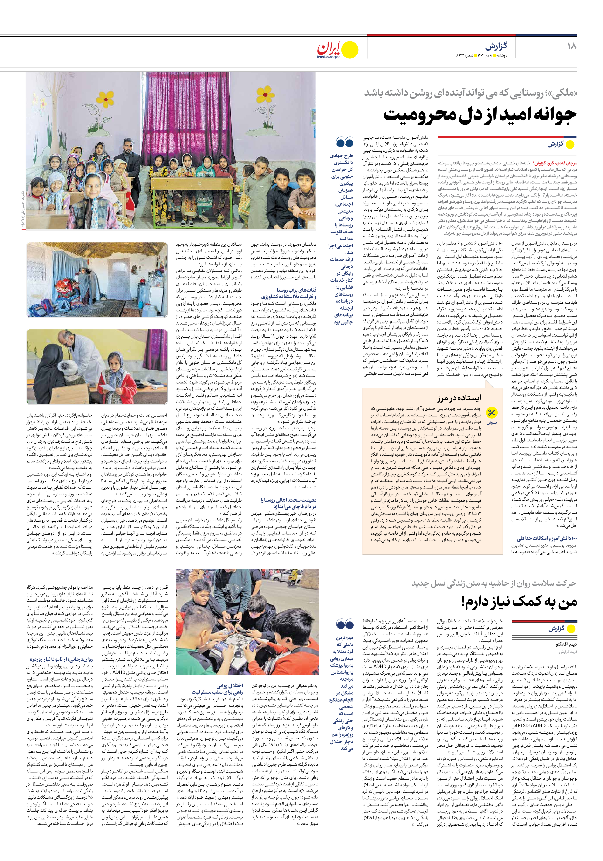 مرجان قندی- گروه گزارش / خانههای خشتی، بادهای شدید و چهرههای آفتابسوخته مردمی که سالهاست با کمبود امکانات کنار آمدهاند، تصویر ثابت از روستای ملکی است؛ روستایی در نقطه صفر مرزی با افغانستان در استان خراسان جنوبی. فاصله این روستا از شهر فقط چند ساعت است، اما فاصله اهالی روستا از فرصتهای شغلی، آموزشی و آینده بسیار زیاد است. اینجا زندگی شبیه نخی باریک است که مردماش هر روز با دستهای خسته، اما امیدوار آن را نگه میدارند. اینجا صبحها با صدای باد آغاز میشود، نه زنگ مدرسه. جوانان روستا که اغلب کارگرند همیشه در رفت و آمد بین روستا و شهرهای اطراف هستند تا کسب درآمد کنند. آینده در این روستا برای اهالیاش مثل قناتهای پنهان زیر خاک روستاست؛ وجود دارد اما دسترسی به آن آسان نیست. کودکانش با وجود همه کمبودها دست از رؤیاهایشان برنداشتهاند. دخترانشان میخواهند وکیل، معلم و دکتر بشوند و پسرانشان در آرزوی داشتن موتور ۲۰۰۰ هستند. آمال و آرزوهای این کودکان نشان میدهد حتی در دورترین نقطه مرزی هم امید میتواند از دل محرومیت جوانه بزند.