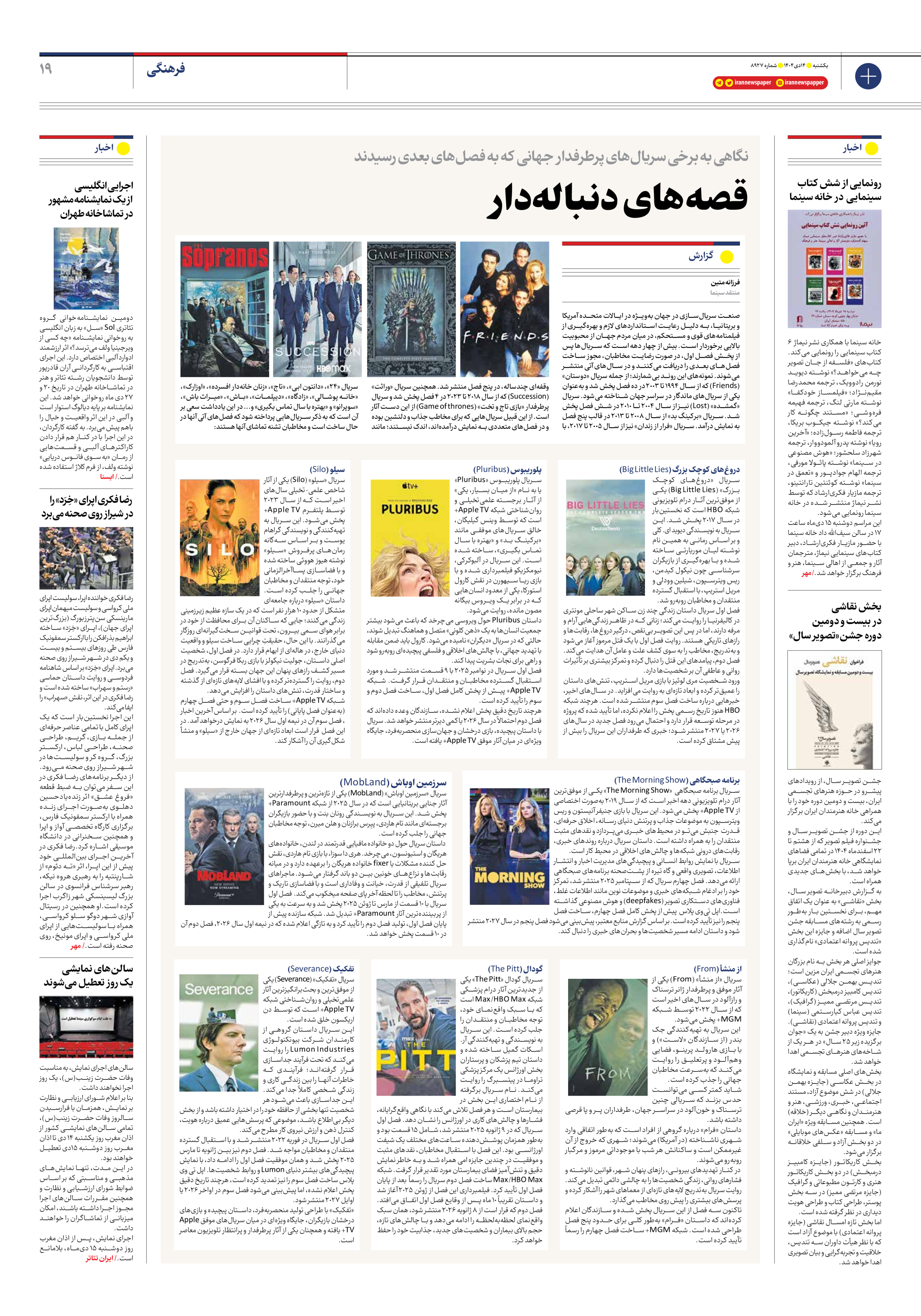صنعت سریالسازی در جهان بهویژه در ایالات متحده آمریکا و بریتانیا، به دلیل رعایت استانداردهای لازم و بهرهگیری از فیلمنامههای قوی و مستحکم، در میان مردم جهان از محبوبیت بالایی برخوردار است. بیش از چهار دهه است که سریالها پس از پخش فصل اول، در صورت رضایت مخاطبان، مجوز ساخت فصلهای بعدی را دریافت میکنند و در سالهای آتی منتشر میشوند. نمونههای این روند بیشمارند؛ از جمله سریال «دوستان» (Friends) که از سال ۱۹۹۴ تا ۲۰۰۳ در ده فصل پخش شد و بهعنوان یکی از سریالهای ماندگار در سراسر جهان شناخته میشود. سریال «گمشده» (Lost) نیز از سال ۲۰۰۴ تا ۲۰۱۰ در شش فصل پخش شد. سریال «برکینگ بد» از سال ۲۰۰۸ تا ۲۰۱۳ در قالب پنج فصل به نمایش درآمد. سریال «فرار از زندان» نیز از سال ۲۰۰۵ تا ۲۰۱۷، با وقفهای چندساله، در پنج فصل منتشر شد. همچنین سریال «وراثت» (Succession) که از سال ۲۰۱۸ تا ۲۰۲۳ در ۴ فصل پخش شد و سریال پرطرفدار «بازی تاج و تخت» (Game of thrones) از این دست آثار است. از این قبیل سریالهایی که برای مخاطب جذاب و دلنشین بوده و در فصلهای متعددی به نمایش درآمدهاند، اندک نیستند؛ مانند سریال «۲۴»، «دانتون ابی»، «تاج»، «زنان خانهدار افسرده»، «اوزارک»، «خانه پوشالی»، «زادگاه»، «دیپلمات»، «باش»، «میراث باش»، «سوپرانو» و «بهتره با سال تماس بگیری» و... در این یادداشت سعی بر آن است که به ذکر سریالهایی پرداخته شود که فصلهای آتی آنها در حال ساخت است و مخاطبان تشنه تماشای آنها هستند: