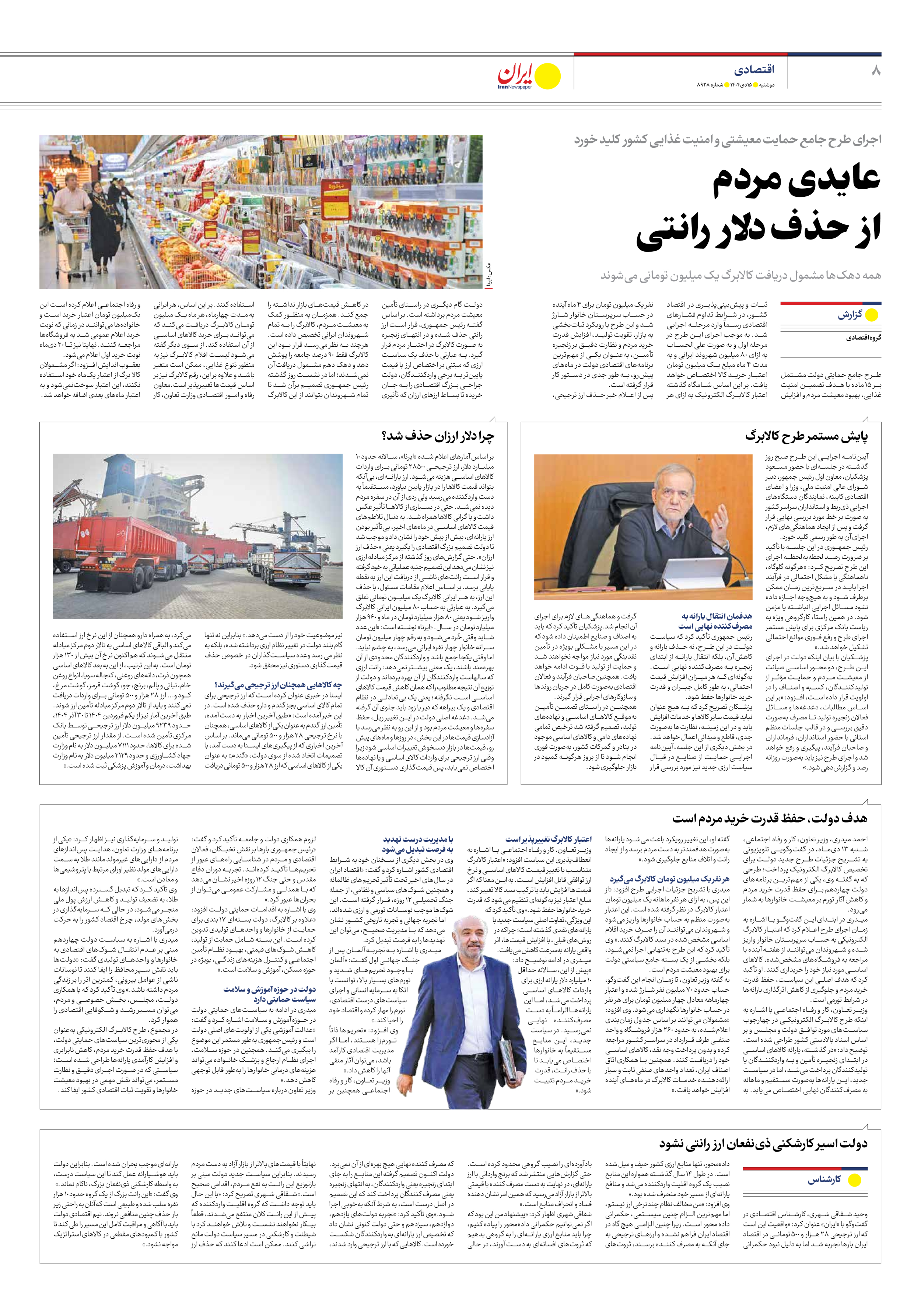طرح جامع حمایتی دولت مشتمل بر ۱۵ ماده با هدف تضمین امنیت غذایی، بهبود معیشت مردم و افزایش ثبات و پیشبینیپذیری در اقتصاد کشور، در شرایط تداوم فشارهای اقتصادی رسماً وارد مرحله اجرایی شد. به موجب اجرای این طرح در مرحله اول و به صورت علیالحساب به ازای ۸۰ میلیون شهروند ایرانی و به مدت ۴ ماه مبلغ یک میلیون تومان اعتبار خرید کالا اختصاص خواهد یافت. بر این اساس شامگاه گذشته اعتبار کالابرگ الکترونیک به ازای هر نفر یک میلیون تومان برای ۴ ماه آینده در حساب سرپرستان خانوار شارژ شد و این طرح با رویکرد ثباتبخشی به بازار، تقویت تولید، افزایش قدرت خرید مردم و نظارت دقیق بر زنجیره تأمین، بهعنوان یکی از مهمترین برنامههای اقتصادی دولت در ماههای پیشرو، به طور جدی در دستور کار قرار گرفته است. پس از اعلام خبر حذف ارز ترجیحی، دولت گام دیگری در راستای تأمین معیشت مردم برداشته است. بر اساس گفته رئیس جمهوری، قرار است ارز رانتی حذف شده و در انتهای زنجیره به صورت کالابرگ در اختیار مردم قرار گیرد. به عبارتی با حذف یک سیاست ارزی که مبتنی بر اختصاص ارز با قیمت پایینتر به برخی واردکنندگان، دولت جراحی بزرگ اقتصادی را به جان خریده تا بساط ارزهای ارزان که تأثیری در کاهش قیمتهای بازار نداشته را جمع کند. همزمان به منظور کمک به معیشت مردم، کالابرگ را به تمام شهروندان ایرانی تخصیص داده است. هرچند به نظر میرسد قرار بود این کالابرگ فقط ۹۰ درصد جامعه را پوشش دهد و دهک دهم مشمول دریافت آن نمیشدند؛ اما در نشست روز گذشته رئیس جمهوری تصمیم برآن شد تا تمام شهروندان بتوانند از این کالابرگ استفاده کنند. بر این اساس، هر ایرانی به مدت چهارماه، هر ماه یک میلیون تومان کالابرگ دریافت میکند که میتواند برای خرید کالاهای اساسی از آن استفاده کند. از سوی دیگر گفته میشود لیست اقلام کالابرگ نیز به منظور تنوع غذایی، ممکن است متغیر باشد و علاوه بر این، رقم کالابرگ نیز بر اساس قیمتها تغییرپذیر است.معاون رفاه و امور اقتصادی وزارت تعاون، کار و رفاه اجتماعی اعلام کرده است این یکمیلیون تومان اعتبار خرید است و خانوادهها میتوانند در زمانی که نوبت خرید اعلام عمومی شد به فروشگاهها مراجعه کنند. نهایتا نیز تا ۲۰ دیماه نوبت خرید اول اعلام میشود. یعقوب اندایش افزود: اگر مشمولان کالا برگ از اعتبار یکماه خود استفاده نکنند، این اعتبار سوختنمیشود و به اعتبار ماههای بعدی اضافه خواهد شد.