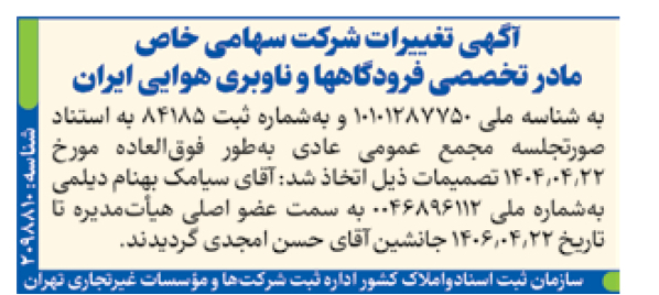 آگهی تغییرات شرکت سهامی خاص مادر تخصصی فرودگاهها و ناوبری هوایی ایران
