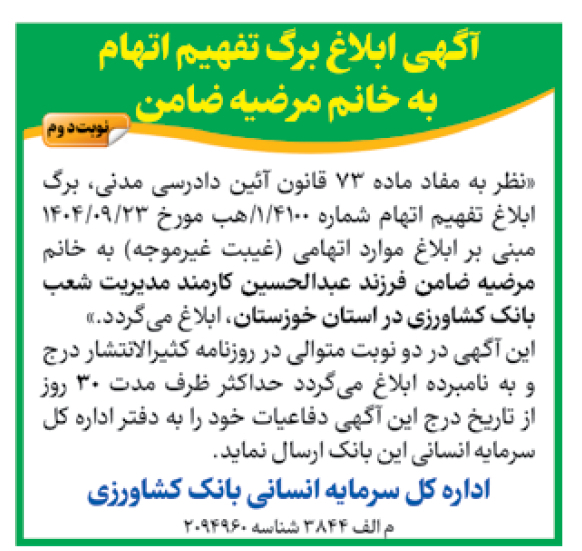 این آگهی در دو نوبت متوالی در روزنامه کثیرالانتشار درج و به نامبرده ابلاغ میگردد حداکثر ظرف مدت 30 روز از تاریخ درج این آگهی دفاعیات خود را به دفتر اداره کل سرمایه انسانی این بانک ارسال نماید.