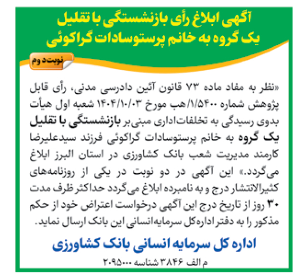 «نظر به مفاد ماده 73 قانون آئین دادرسی مدنی، رأی قابل پژوهش شماره 5400/1/هب مورخ 03/10/1404 شعبه اول هیأت بدوی رسیدگی به تخلفاتاداری مبنیبر بازنشستگی با تقلیل یک گروه به خانم پرستوسادات گراکوئی فرزند سیدعلیرضا کارمند مدیریت شعب بانک کشاورزی در استان البرز ابلاغ میگردد.» این آگهی در دو نوبت در یکی از روزنامههای کثیرالانتشار درج و به نامبرده ابلاغ میگردد حداکثر ظرف مدت 30 روز از تاریخ درج این آگهی درخواست اعتراض خود از حکم مذکور را به دفتر ادارهکل سرمایهانسانی این بانک ارسال نماید.