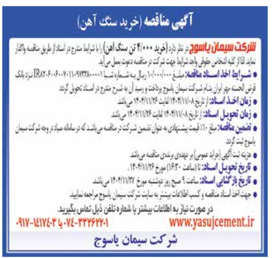 در حافظه موقت ذخیره شد... تصویر مناقصه شرکت سیمان یاسوج ۰۸ بهمن ۱۴۰۴ شماره هشت هزار و نهصد و چهل و هفت - صفحه ۱۰