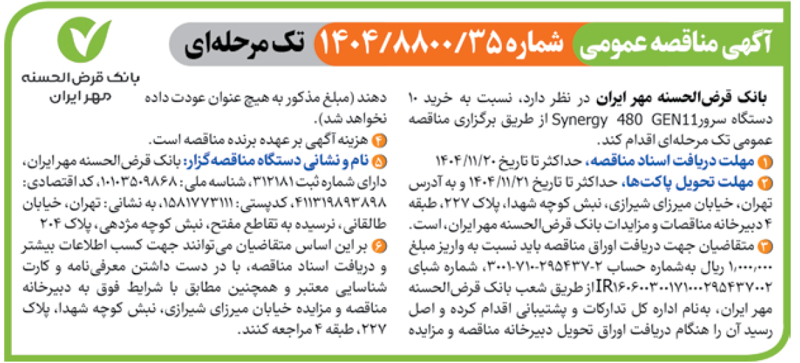 نام و نشانی دستگاه مناقصهگزار: بانک قرضالحسنه مهر ایران، دارای شماره ثبت 312181، شناسه ملی: 10103509868، کد اقتصادی: 411319893898، کدپستی: ۱۵۸۱۷۷۳۱۱۱، به نشانی: تهران، خیابان طالقانی، نرسیده به تقاطع مفتح، نبش کوچه مژدهی، پلاک ۲۰۴
