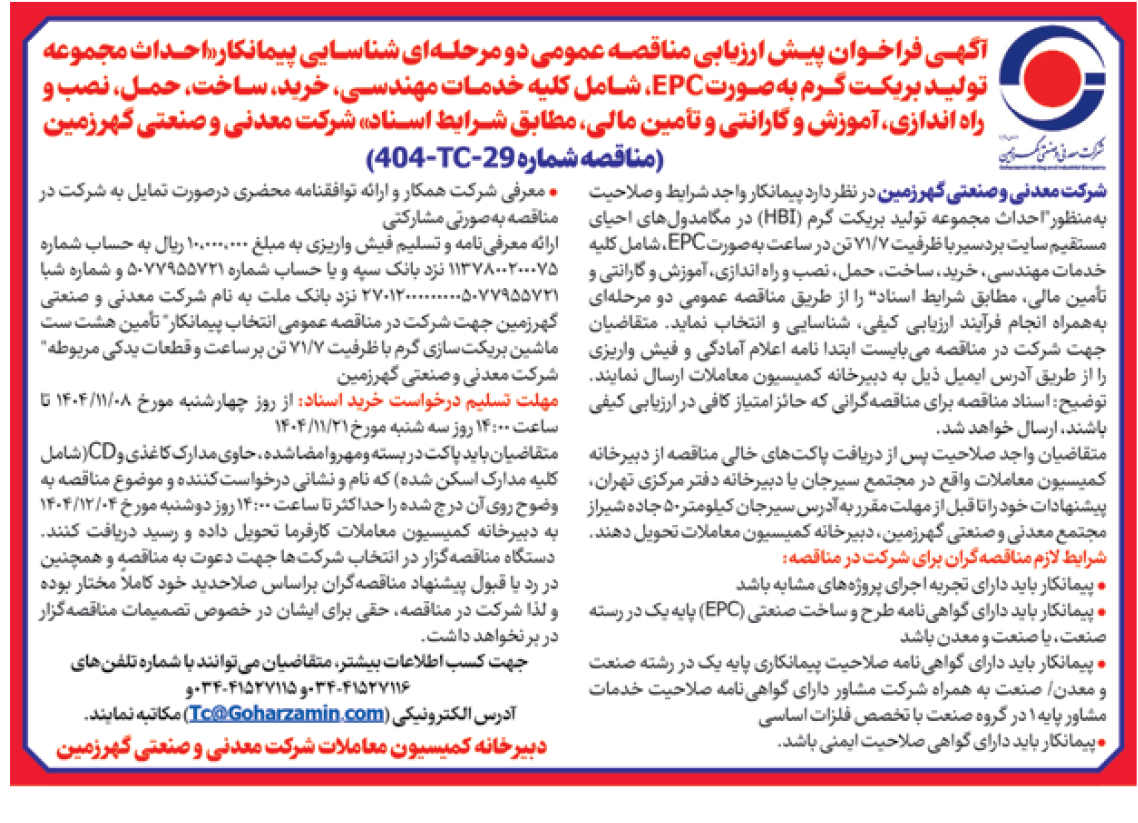 آگهی فراخوان پیش ارزیابی مناقصه عمومی دو مرحلهای شناسایی پیمانکار«احداث مجموعه تولید بریکت گرم بهصورت EPC، شامل کلیه خدمات مهندسی، خرید، ساخت، حمل، نصب و راه اندازی، آموزش و گارانتی و تأمین مالی، مطابق شرایط اسناد» شرکت معدنی و صنعتی گهرزمین