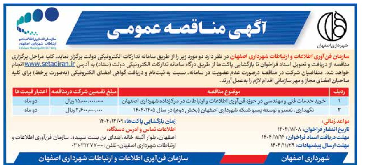 سازمان فنآوری اطلاعات و ارتباطات شهرداری اصفهان در نظر دارد دو مورد زیر را از طریق سامانه تدارکات الکترونیکی دولت برگزار نماید. کلیه مراحل برگزاری مناقصه از دریافت و تحویل اسناد فراخوان تا بازگشایی پاکتها از طریق درگاه سامانه تدارکات الکترونیکی دولت (ستاد) به آدرس www.setadiran.ir انجام خواهد شد. متقاضیان شرکت در مناقصه درصورت عدم عضویت در سامانه، نسبت به ثبتنام و دریافت گواهی امضای الکترونیکی (بهصورت برخط) برای کلیه صاحبان امضای مجاز و مهر سازمانی اقدام لازم را بهعمل آورند.