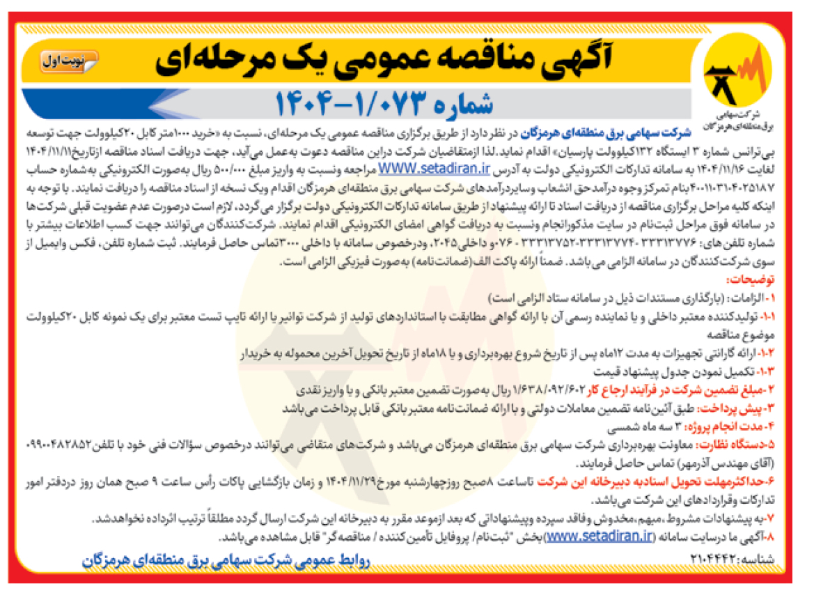 آگهی مناقصه عمومی یک مرحلهای شماره ۰۷۳/۱-۱۴۰۴
