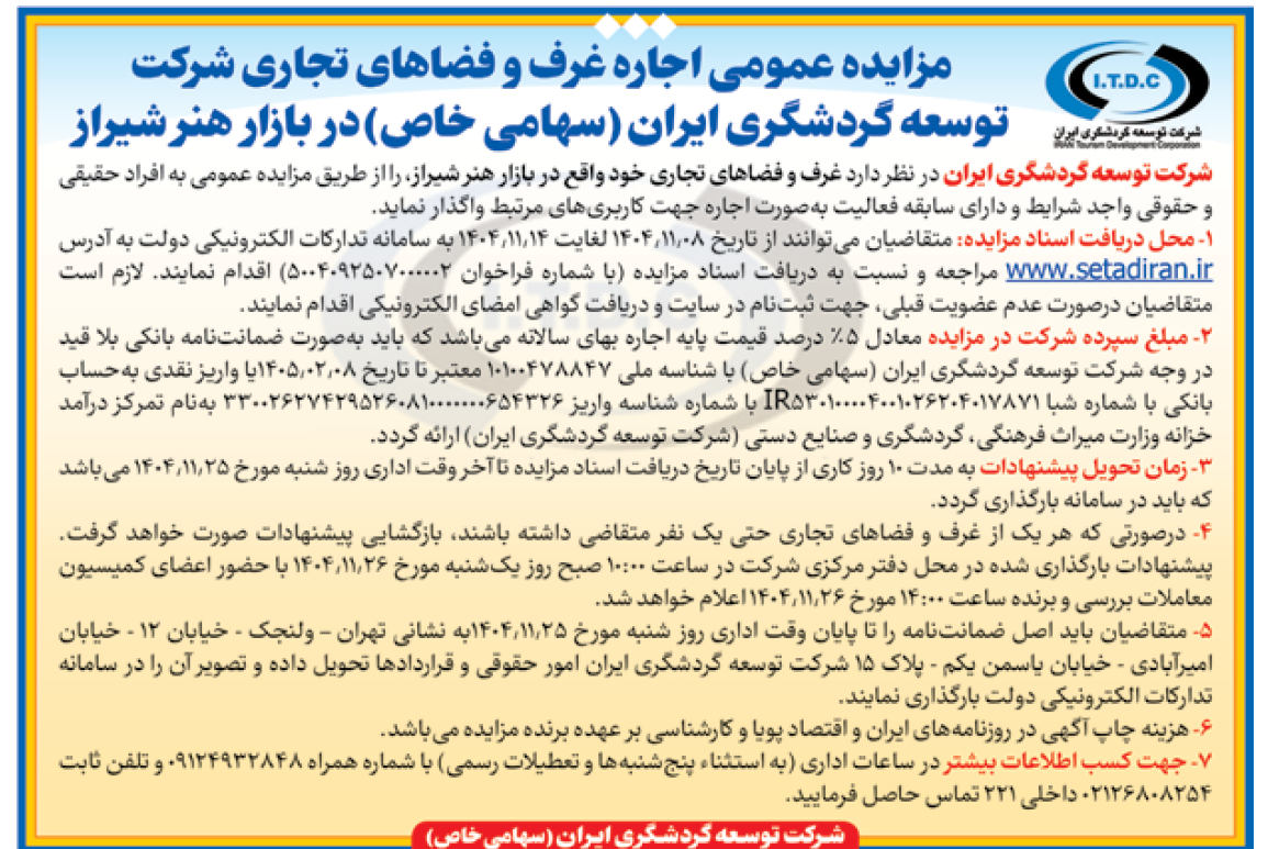 مزایده عمومی اجاره غرف و فضاهای تجاری شرکت توسعه گردشگری ایران (سهامی خاص) در بازار هنر شیراز