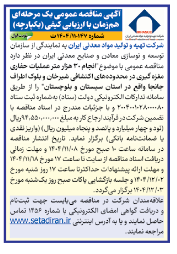 آگهی مناقصه عمومی یک مرحلهای همزمان با ارزیابی کیفی (یکپارچه)