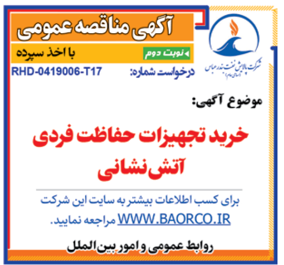 در حافظه موقت ذخیره شد... تصویر خرید تجهیزات حفاظت فردی آتش نشانی شرکت پالایش نفت بندرعباس ۰۸ بهمن ۱۴۰۴ شماره هشت هزار و نهصد و چهل و هفت - صفحه ۲ خرید تجهیزات حفاظت فردی آتش نشانیبرای کسب اطلاعات بیشتر به سایت این شرکتWWW.BAORCO.IR مراجعه نمایید.