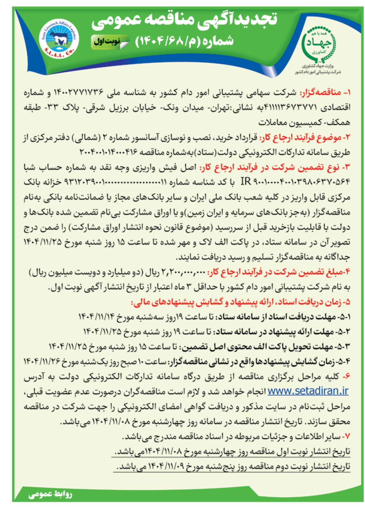 تاریخ انتشار نوبت اول مناقصه روز چهارشنبه مورخ 08/11/1404میباشد.)