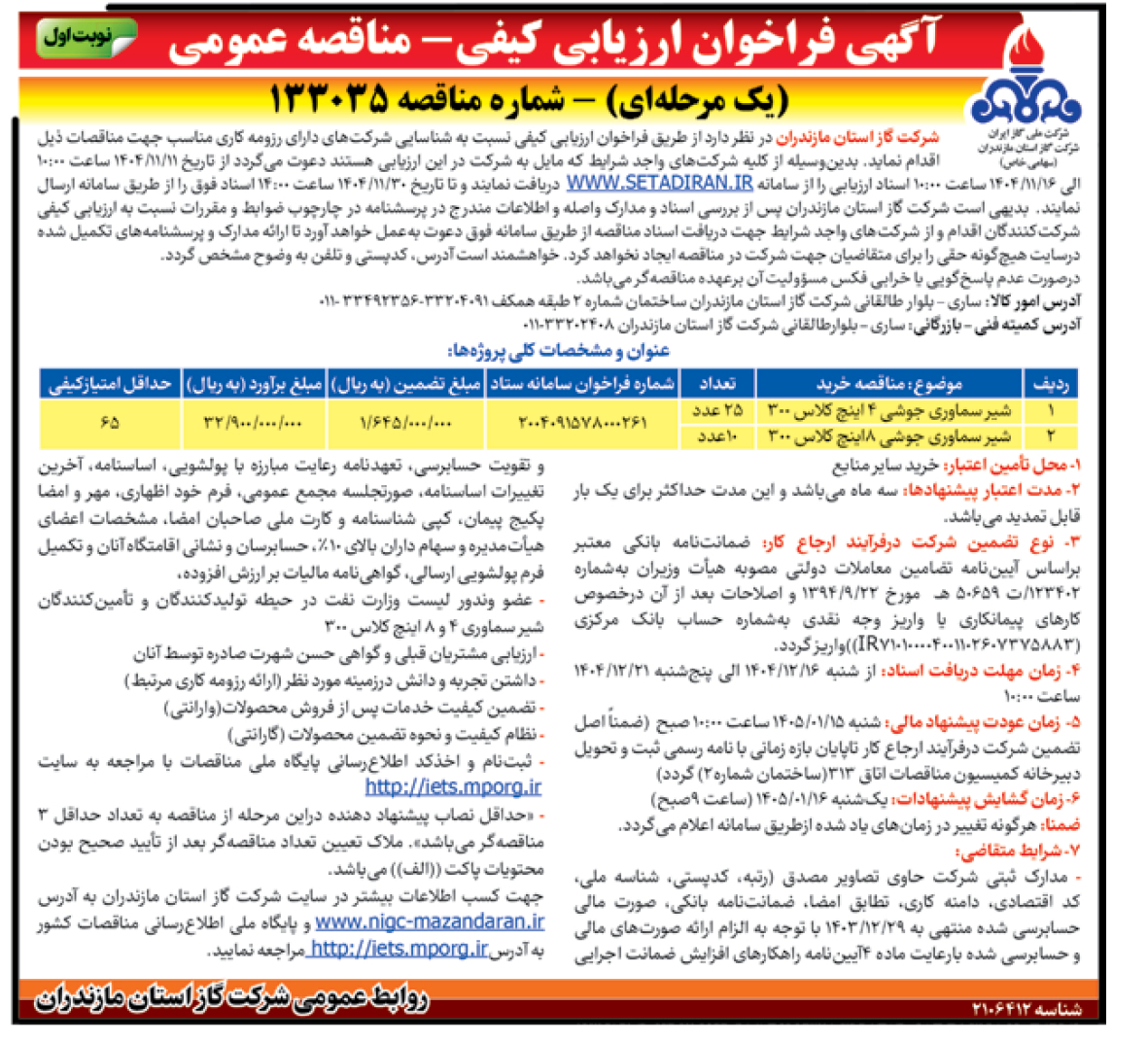 شرکت گاز استان مازندران در نظر دارد از طریق فراخوان ارزیابی کیفی نسبت به شناسایی شرکتهای دارای رزومه کاری مناسب جهت مناقصات ذیل اقدام نماید. بدینوسیله از کلیه شرکتهای واجد شرایط که مایل به شرکت در این ارزیابی هستند دعوت میگردد از تاریخ 11/11/1404 ساعت 10:00 الی 16/11/1404 ساعت 10:00 اسناد ارزیابی را از سامانه WWW.SETADIRAN.IR دریافت نمایند و تا تاریخ 30/11/1404 ساعت 14:00 اسناد فوق را از طریق سامانه ارسال نمایند. بدیهی است شرکت گاز استان مازندران پس از بررسی اسناد و مدارک واصله و اطلاعات مندرج در پرسشنامه در چارچوب ضوابط و مقررات نسبت به ارزیابی کیفی شرکتکنندگان اقدام و از شرکتهای واجد شرایط جهت دریافت اسناد مناقصه از طریق سامانه فوق دعوت بهعمل خواهد آورد تا ارائه مدارک و پرسشنامههای تکمیل شده درسایت هیچگونه حقی را برای متقاضیان جهت شرکت در مناقصه ایجاد نخواهد کرد. خواهشمند است آدرس، کدپستی و تلفن به وضوح مشخص گردد.