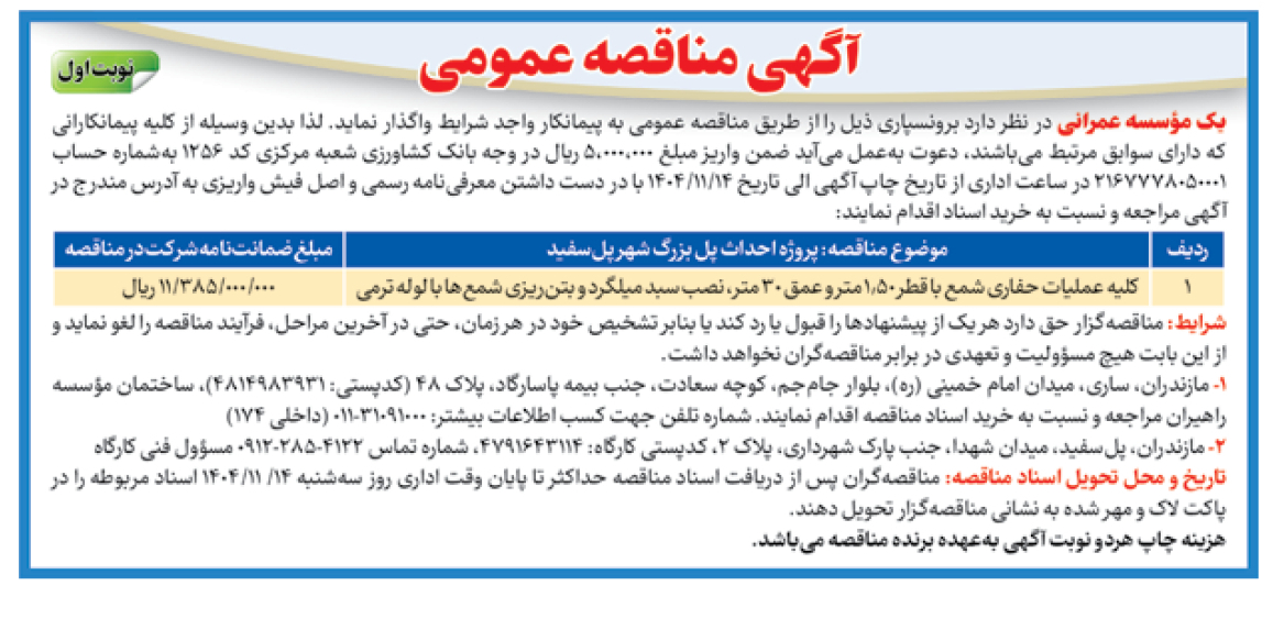یک مؤسسه عمرانی در نظر دارد برونسپاری ذیل را از طریق مناقصه عمومی به پیمانکار واجد شرایط واگذار نماید. لذا بدین وسیله از کلیه پیمانکارانی که دارای سوابق مرتبط میباشند، دعوت بهعمل میآید ضمن واریز مبلغ 5،000،000 ریال در وجه بانک کشاورزی شعبه مرکزی کد 1256 بهشماره حساب 2167778050001 در ساعت اداری از تاریخ چاپ آگهی الی تاریخ 14/11/1404 با در دست داشتن معرفینامه رسمی و اصل فیش واریزی به آدرس مندرج در آگهی مراجعه و نسبت به خرید اسناد اقدام نمایند: