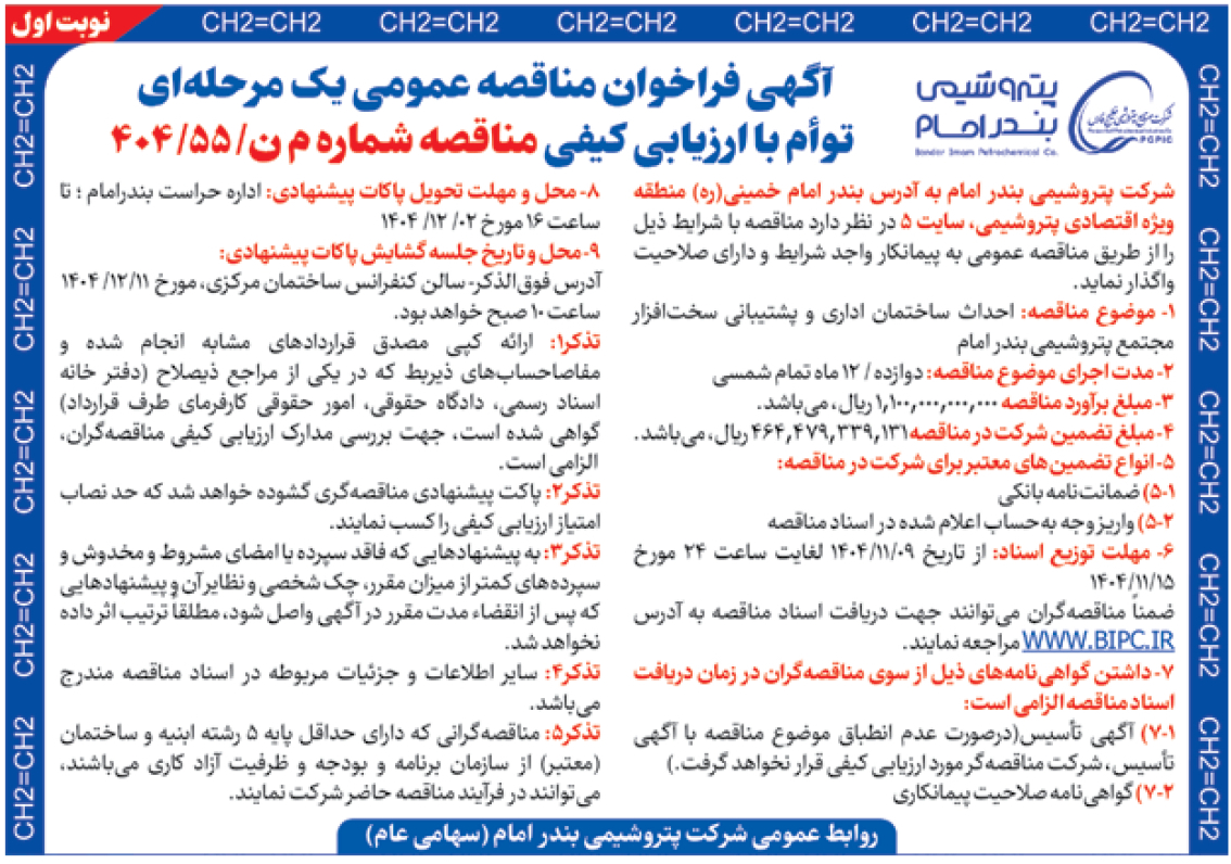 شرکت پتروشیمی بندر امام به آدرس بندر امام خمینی(ره) منطقه ویژه اقتصادی پتروشیمی، سایت 5 در نظر دارد مناقصه با شرایط ذیل را از طریق مناقصه عمومی به پیمانکار واجد شرایط و دارای صلاحیت واگذار نماید.