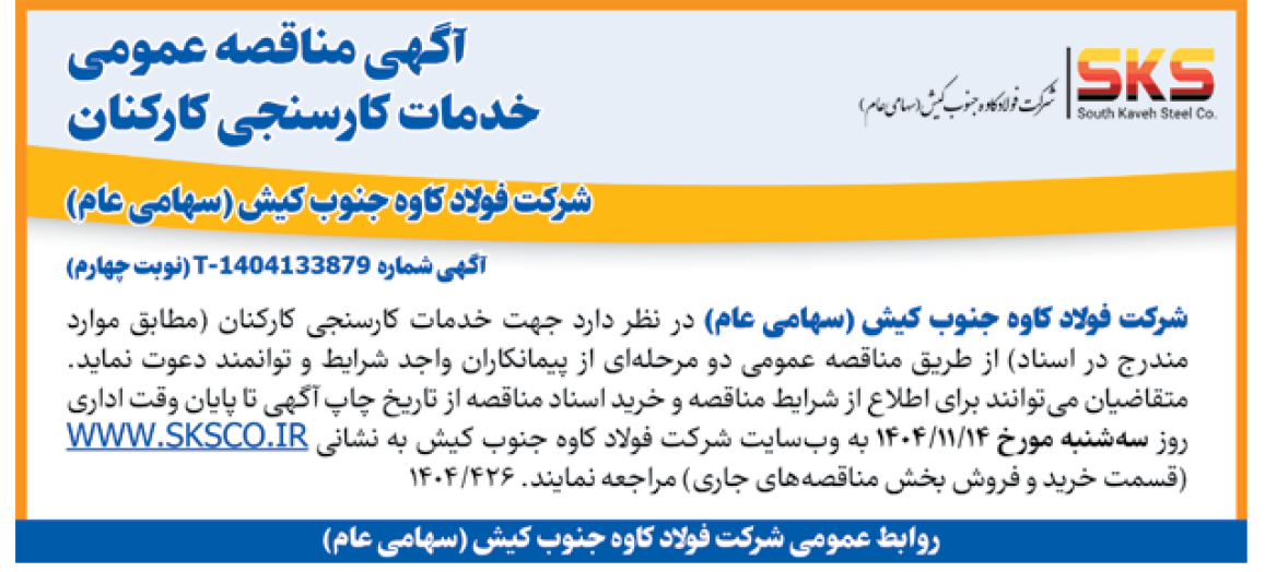 شرکت فولاد کاوه جنوب کیش (سهامی عام) در نظر دارد جهت خدمات کارسنجی کارکنان (مطابق موارد مندرج در اسناد) از طریق مناقصه عمومى دو مرحلهای از پیمانکاران واجد شرایط و توانمند دعوت نماید. متقاضیان میتوانند برای اطلاع از شرایط مناقصه و خرید اسناد مناقصه از تاریخ چاپ آگهی تا پایان وقت اداری روز سهشنبه مورخ 14/11/1404 به وبسایت شرکت فولاد کاوه جنوب کیش به نشانی WWW.SKSCO.IR (قسمت خرید و فروش بخش مناقصههای جاری) مراجعه نمایند. 426/1404