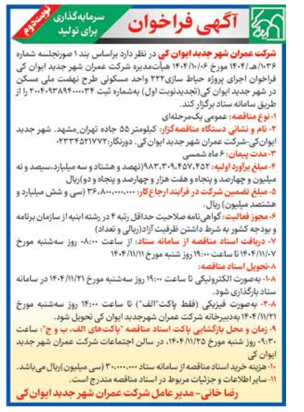 2- نام و نشانی دستگاه مناقصهگزار: کیلومتر 55 جاده تهران_مشهد. شهر جدید ایوانکی-شرکت عمران شهر جدید ایوانکی. دورنگار:02334521772