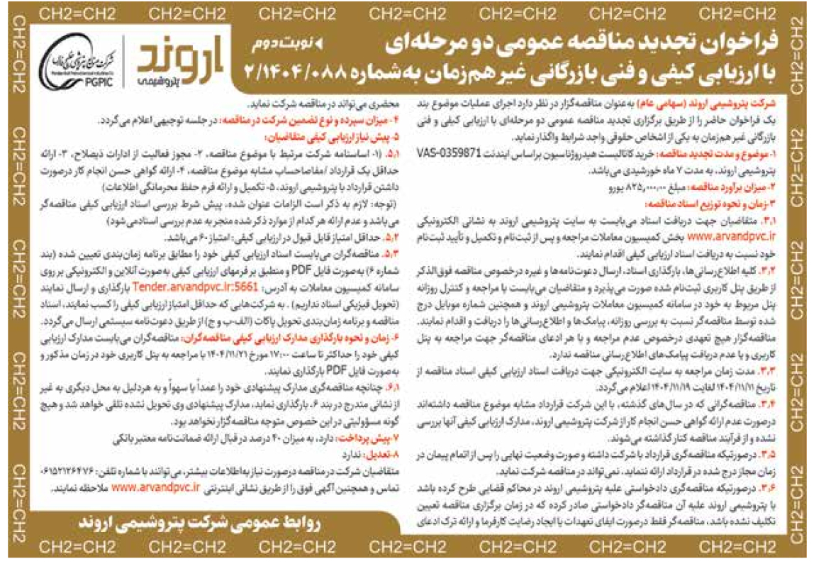 متقاضیان شرکت در مناقصه درصورت نیاز بهاطلاعات بیشتر، میتوانند با شماره تلفن: 06152126476 تماس و همچنین آگهی فوق را از طریق نشانی اینترنتی www.arvandpvc.ir ملاحظه نمایند.