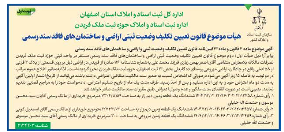 برابر آرا ذیل هیأت اول/ دوم موضوع قانون تعیین تکلیف وضعیت ثبتی اراضی و ساختمانهای فاقد سند رسمی مستقر در واحد ثبتی حوزه ثبت ملک فریدن تصرفات مالکانه بلامعارض متقاضی آقای اصغر بهمن زیاری فرزند محمد علی بهشماره شناسنامه ۱۱۶ صادره از فریدن در اراضی ذیل بر روی قسمتی از پلاک ۳ فرعی از ۵۸ اصلی واقع در چادگان- اراضی مزروعی روستای ده کلبعلی بخش ۱۳ ثبت اصفهان- حوزه ثبت ملک فریدن محرز گردیده است. لذا بهمنظور اطلاع عموم مراتب در دو نوبت به فاصله ۱۵ روز آگهی میشود درصورتی که اشخاص نسبت به صدور سند مالکیت متقاضی اعتراضی داشته باشند میتوانند از تاریخ انتشار اولین آگهی به مدت دو ماه اعتراض خود را به این اداره تسلیم و پس از اخذ رسید، ظرف مدت یک ماه از تاریخ تسلیم اعتراض، دادخواست خود را به مراجع قضایی تقدیم نمایند. بدیهی است در صورت انقضای مدت مذکور و عدم وصول اعتراض طبق مقررات سند مالکیت صادر خواهد شد.