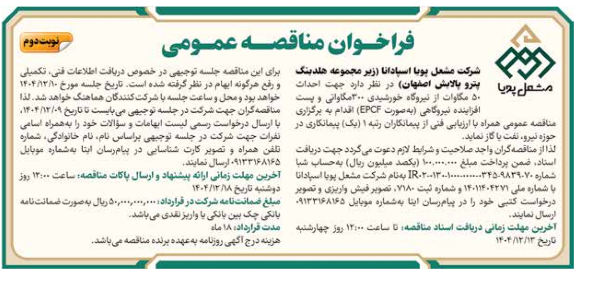 لذا از مناقصهگران واجد صلاحیت و شرایط لازم دعوت میگردد جهت دریافت اسناد، ضمن پرداخت مبلغ ۱۰۰.۰۰۰.۰۰۰ (یکصد میلیون ریال) بهحساب شبا شماره 70-9839-0345-0000-1000-0130-IR02 بهنام شرکت مشعل پویا اسپادانا با شماره ملی ۱۴۰۱۱۴۰۴۲۷۱ و شماره ثبت ۷۱۸۰، تصویر فیش واریزی و تصویر درخواست کتبی خود را در پیامرسان ایتا بهشماره موبایل ۰۹۱۳۳۱۶۸۱۶۵ ارسال نمایند.