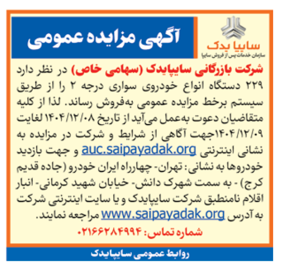 شرکت بازرگانی سایپایدک (سهامی خاص) در نظر دارد 229 دستگاه انواع خودروی سواری درجه 2 را از طریق سیستم برخط مزایده عمومی بهفروش رساند. لذا از کلیه متقاضیان دعوت بهعمل میآید از تاریخ 08/12/1404 لغایت 09/12/1404جهت آگاهی از شرایط و شرکت در مزایده به نشانی اینترنتی auc.saipayadak.org و جهت بازدید خودروها به نشانی: تهران- چهارراه ایران خودرو (جاده قدیم کرج) - به سمت شهرک دانش- خیابان شهید کرمانی- انبار اقلام نامنطبق شرکت سایپایدک و یا سایت اینترنتی شرکت به آدرس www.saipayadak.org مراجعه نمایند.