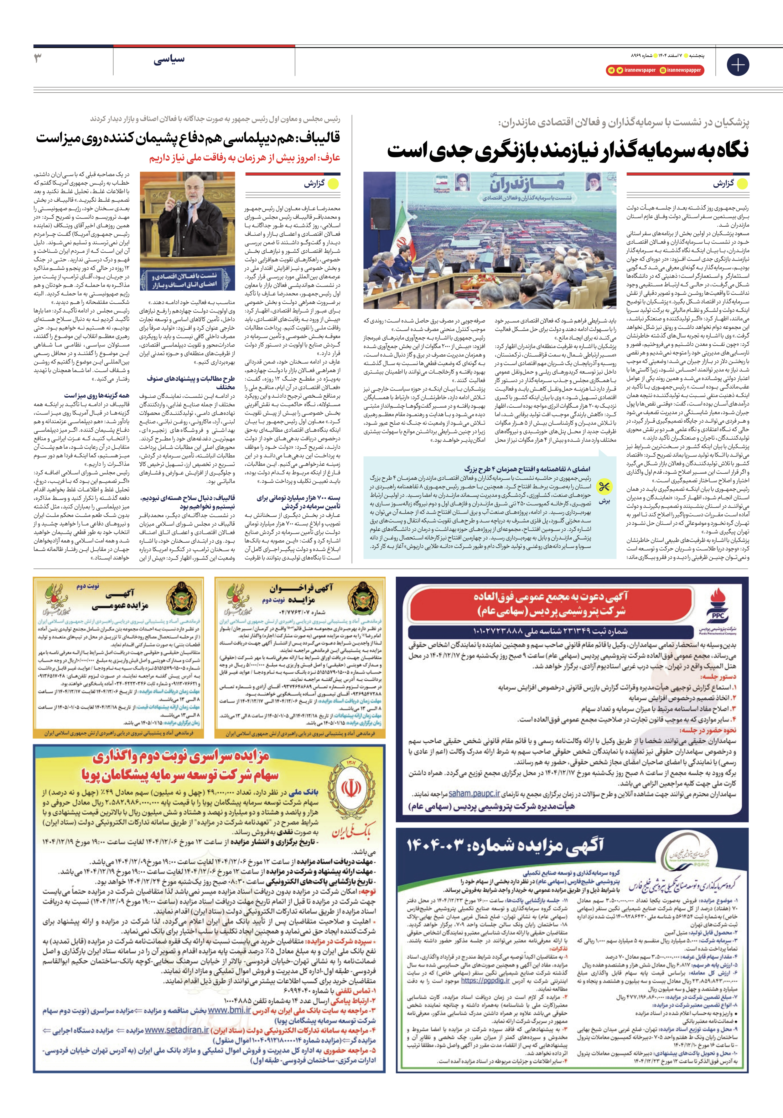 در نشست جداگانهای دیگر، محمدباقر قالیباف در مجلس شورای اسلامی میزبان فعالان اقتصادی و اعضای اتاق اصناف بود. وی در ابتدای سخنان خود، با اشاره به سخنان ترامپ در کنگره امریکا درباره وضعیت این کشور، اظهار کرد: «پیش از این در یک مصاحبه قبلی که با سیانان داشتم، خطاب به رئیس جمهوری آمریکا گفتم که با اطلاعات غلط، تحلیل غلط نکنید و بعد تصمیم غلط نگیرید.» قالیباف در بخش بعدی سخنان خود، رژیم صهیونیستی را مهد تروریسم دانست و تصریح کرد: «در همین روزهای اخیر آقای ویتکاف (نماینده رئیس جمهوری آمریکا) گفت چرا مردم ایران نمیترسند و تسلیم نمیشوند. دلیل آن این است که از مردم ایران شناخت و فهم و درک درستی ندارید. حتی در جنگ ۱۲ روزه در حالی که دور پنجم و ششم مذاکره در جریان بود، آقای ترامپ از پشت میز مذاکره به ما حمله کرد. هم خودتان و هم رژیم صهیونیستی به ما حمله کردید. البته شکست مفتضحانه را هم دیدید.»