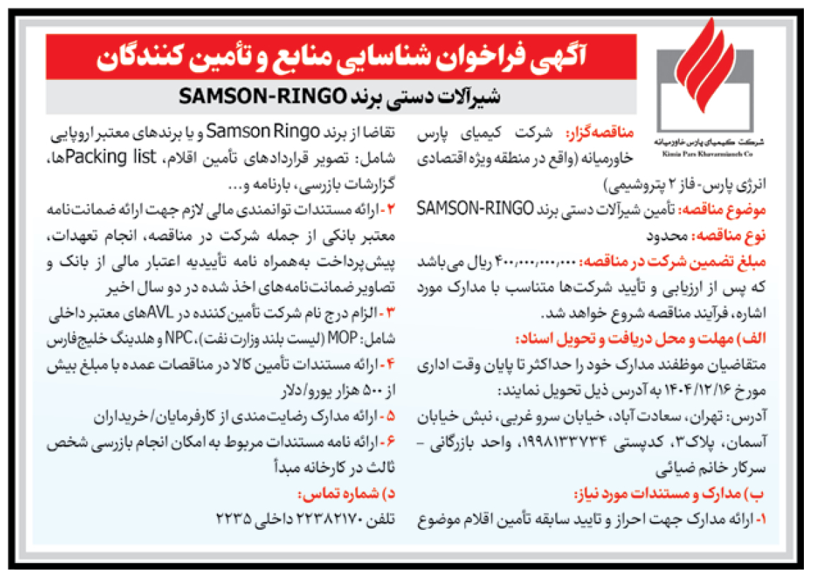 موضوع مناقصه: تأمین شیرآلات دستی برند SAMSON-RINGO