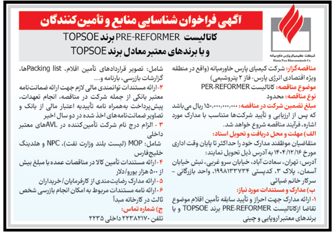 موضوع مناقصه: کاتالیست PER-REFORMER