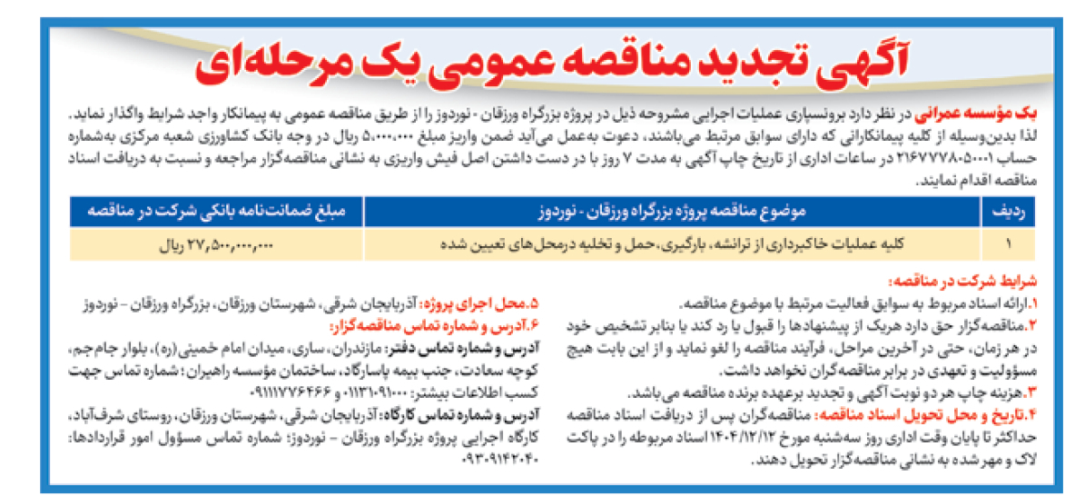 یک مؤسسه عمرانی در نظر دارد برونسپاری عملیات اجرایی مشروحه ذیل در پروژه بزرگراه ورزقان - نوردوز را از طریق مناقصه عمومی به پیمانکار واجد شرایط واگذار نماید. لذا بدینوسیله از کلیه پیمانکارانی که دارای سوابق مرتبط میباشند، دعوت بهعمل میآید ضمن واریز مبلغ 5،000،000 ریال در وجه بانک کشاورزی شعبه مرکزی بهشماره حساب 2167778050001 در ساعات اداری از تاریخ چاپ آگهی به مدت 7 روز با در دست داشتن اصل فیش واریزی به نشانی مناقصهگزار مراجعه و نسبت به دریافت اسناد مناقصه اقدام نمایند.