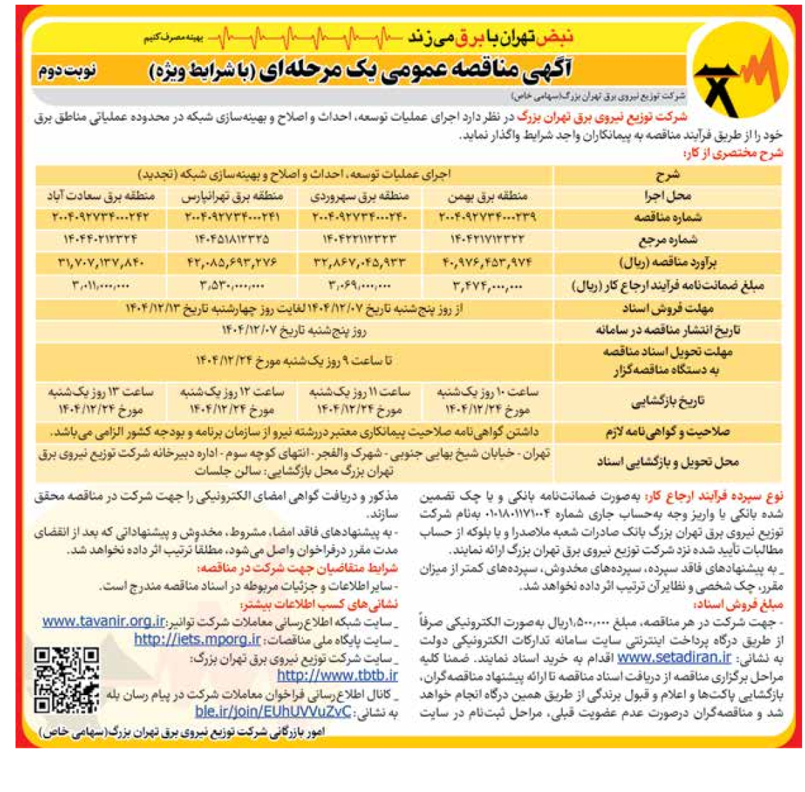 - سایر اطلاعات و جزئیات مربوطه در اسناد مناقصه مندرج است.