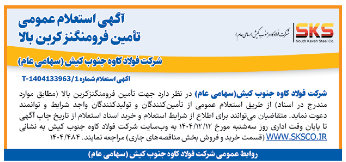 شرکت فولاد کاوه جنوب کیش(سهامی عام) در نظر دارد جهت تأمین فرومنگنزکربن بالا (مطابق موارد مندرج در اسناد) از طریق استعلام عمومى از تأمینکنندگان و تولیدکنندگان واجد شرایط و توانمند دعوت نماید. متقاضیان میتوانند برای اطلاع از شرایط استعلام و خرید اسناد استعلام از تاریخ چاپ آگهی تا پایان وقت اداری روز سهشنبه مورخ 12/12/1404 به وبسایت شرکت فولاد کاوه جنوب کیش به نشانی