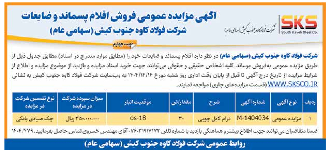 شرکت فولاد کاوه جنوب کیش(سهامی عام) در نظر دارد اقلام پسماند و ضایعات خود را (مطابق موارد مندرج در اسناد) مطابق جدول ذیل از طریق مزایده عمومى بهفروش برساند. کلیه اشخاص حقیقی و حقوقی میتوانند جهت خرید اسناد مزایده و بازدید از موضوع مزایده و اطلاع از شرایط مزایده از تاریخ درج آگهی تا قبل از پایان وقت اداری روز شنبه مورخ 16/12/1404 به وبسایت شرکت فولاد کاوه جنوب کیش به نشانی WWW.SKSCO.IR (قسمت مزایدههای جاری) مراجعه نمایند.481/1404