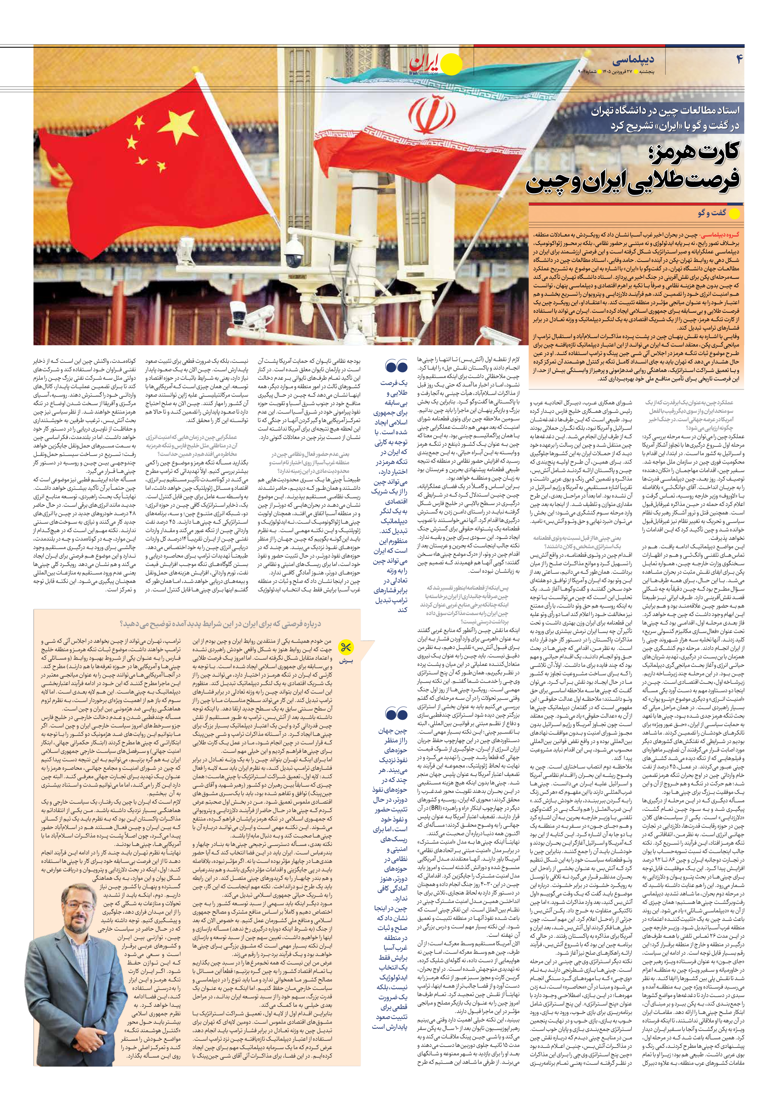 گروه دیپلماسی- چین در بحران اخیر غرب آسیا نشان داد که رویکردش به معادلات منطقه، برخلاف تصور رایج، نه بر پایه ایدئولوژی و نه مبتنی بر حضور نظامی، بلکه بر محور ژئواکونومیک، دیپلماسی عملگرایانه و صبر استراتژیک شکل گرفته است و این فرصتی ارزشمند برای ایران در شکل دهی به روابط تهران-پکن در آینده است. حامد وفایی، استاد مطالعات چین در دانشگاه مطالعات جهان دانشگاه تهران، در گفتوگو با «ایران» با اشاره به این موضوع به تشریح عملکرد سهمرحلهای پکن برای نقشآفرینی در جنگ اخیر میپردازد. استاد دانشگاه تهران تأکید میکند که چین بدون هیچ هزینه نظامی و صرفاً با تکیه بر اهرم اقتصادی و دیپلماسی پنهان، توانست هم امنیت انرژی خود را تضمین کند، هم فرآیند دلارزدایی و پترویوان را تسریع بخشد و هم اعتبار خود را به عنوان میانجی مؤثر در منطقه تثبیت کند. به اعتقاد او، این رویکرد چین یک فرصت طلایی و بیسابقه برای جمهوری اسلامی ایجاد کرده است. ایران میتواند با استفاده از کارت تنگه هرمز، چین را از یک شریک اقتصادی به یک لنگر دیپلماتیک و وزنه تعادل در برابر فشارهای ترامپ تبدیل کند. وفایی با اشاره به نقش پنهان چین در پشت پرده مذاکرات اسلامآباد و استقبال ترامپ از میانجیگری پکن، معتقد است که ایران میتواند از این اعتبار دیپلماتیک تازهیافته چین برای طرح موضوع ثبات تنگه هرمز در اجلاس آتی شی جین پینگ و ترامپ استفاده کند. او در عین حال هشدار میدهد که تهران باید به جای انسداد کامل تنگه بر کنترل هوشمند آن تمرکز کرده و با تعمیق شراکت استراتژیک، هماهنگی روایی ضدهژمونی و پرهیز از وابستگی بیش از حد، از این فرصت تاریخی برای تأمین منافع ملی خود بهرهبرداری کند.