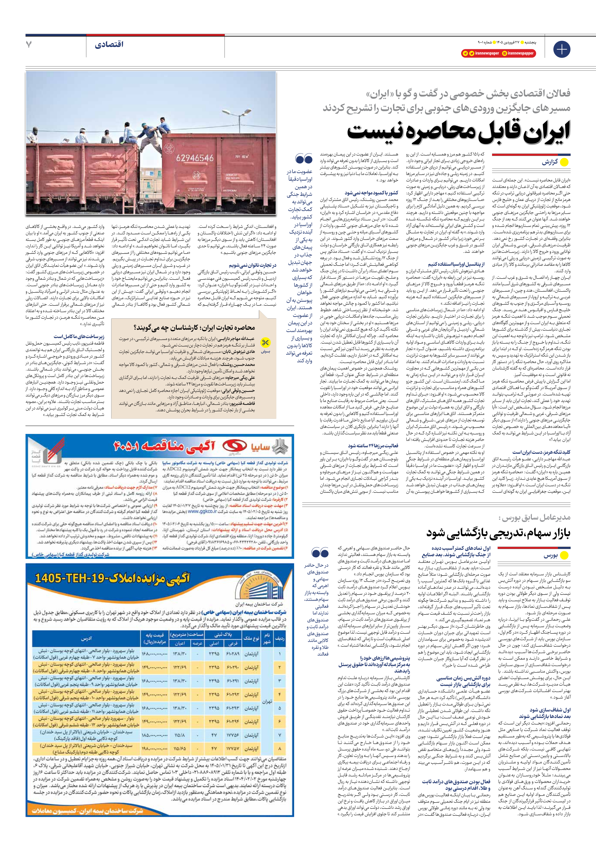عبدالله مهاجر دارابی، عضو هیأت رئیسه اتاق بازرگانی ایران و رئیس اتاق بازرگانی مازندران در همین باره به « ایران» گفت: «محاصره تنگه هرمز از سوی آمریکا هیچ عایدی ندارد. زیرا کلید این تنگه در دست ایران است.» او افزود: «علاوه بر این، موقعیت جغرافیایی ایران به گونهای است که با 15 کشور هم مرز و همسایه است. از این رو راههای خروجی زیادی برای تجار ایرانی وجود دارد. از مسیر دریایی میتوانیم از دریای خزر استفاده کنیم. در زمینه ریلی و جادهای نیز در سایر مرزها امکانات داریم. میتوانیم برای واردات و صادرات از زیرساختهای ریلی، دریایی و زمینی به صورت ترکیبی استفاده کنیم.» مهاجر دارابی اظهار کرد: «ما سناریوهای مختلفی را بعد از جنگ 12 روزه بررسی کردیم. به همین دلیل آمادگی لازم را برای مواجهه با چنین موقعیتی داشته و داریم. هرچند بر این باوریم که محاصره تنگه شکسته شده است و کشتیهای ایرانی توانستهاند به آبهای آزاد وارد شوند.» به گفته او، ایران در تجارت به مشکل بر نمیخورد زیرا بنادر کشور در شمال و مرزهای کشور در شرق و غرب جایگزین مرزهای جنوبی خواهند شد.