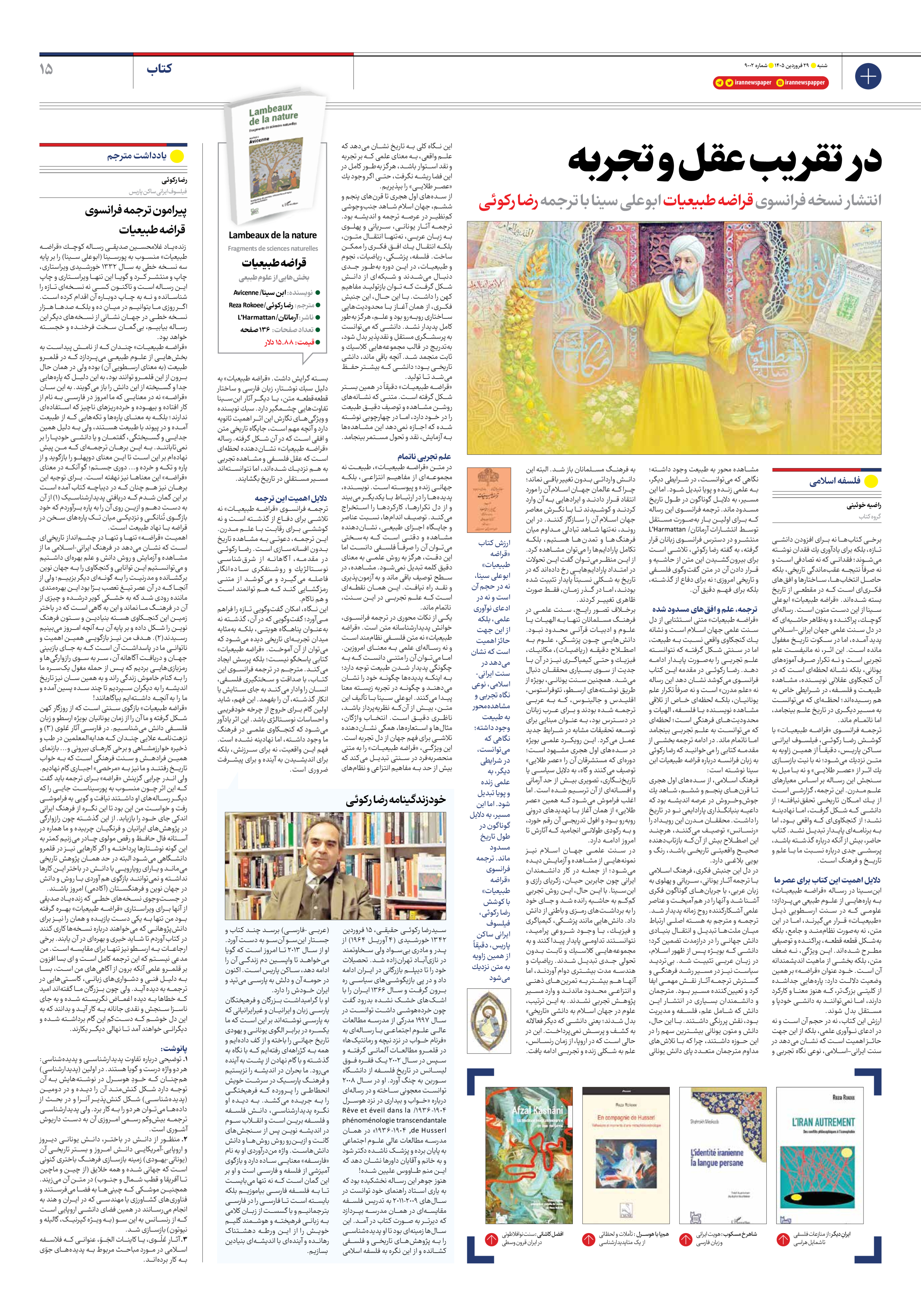 انتشار نسخه فرانسوی قراضه طبیعیات ابوعلی سینا با ترجمه رضا ركوئی