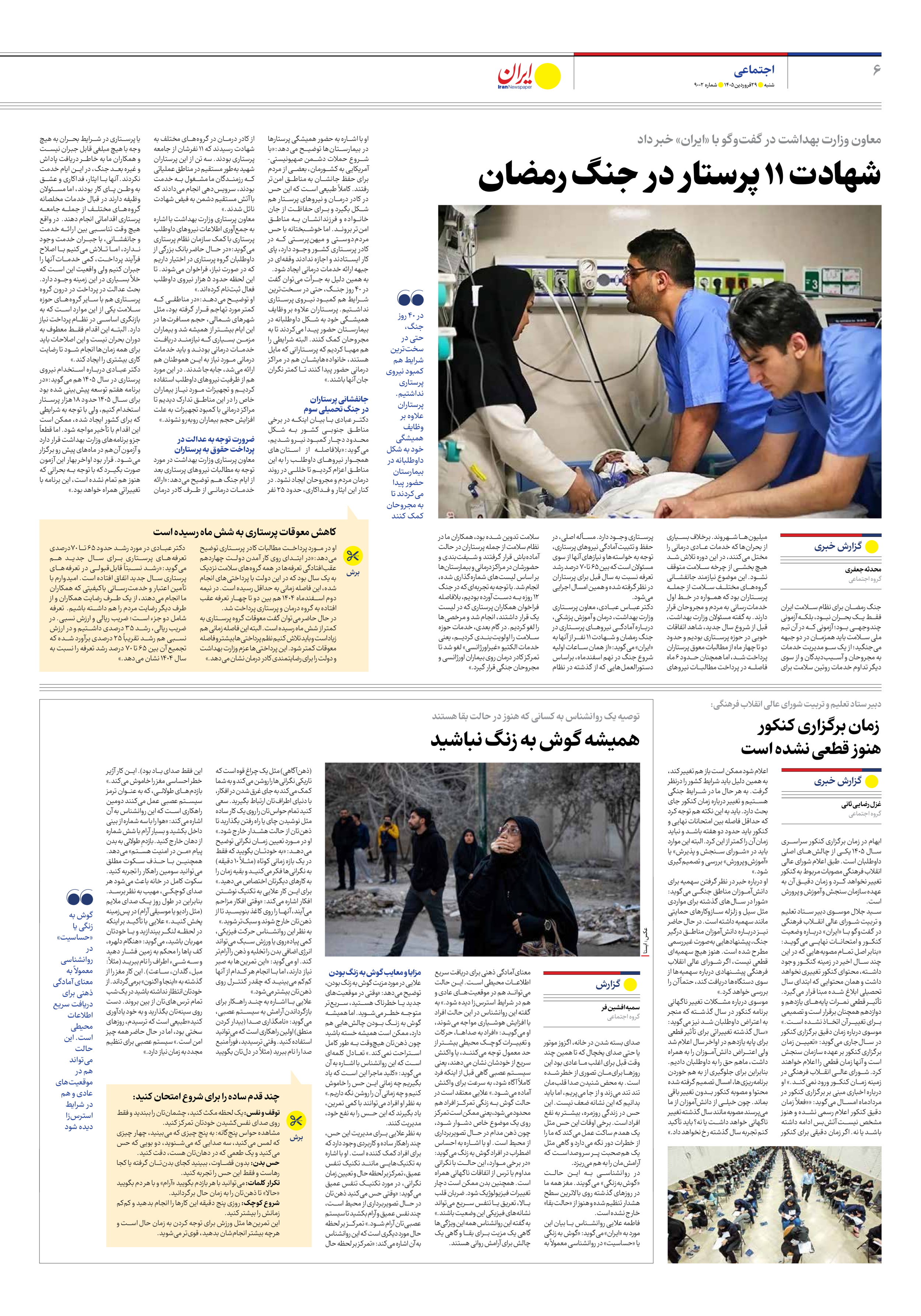 دکتر عباس عبادی، معاون پرستاری وزارت بهداشت، درمان و آموزش پزشکی، درباره آمادگی نیروهای پرستاری در جنگ رمضان و شهادت 11 نفر از آنها به «ایران» میگوید:«از همان ساعات اولیه شروع جنگ در نهم اسفندماه، براساس دستورالعملهایی که از گذشته در نظام سلامت تدوین شده بود، همکاران ما در نظام سلامت از جمله پرستاران در حالت آمادهباش قرار گرفتند و شیفتبندی و حضورشان در مراکز درمانی و بیمارستانها بر اساس لیستهای شمارهگذاری شده، انجام شد. با توجه به تجربهای که در جنگ 12 روزه به دست آورده بودیم، بلافاصله فراخوان همکاران پرستاری که در لیست یک قرار داشتند، انجام شد و مرخصیها را لغو کردیم. در گام بعدی، خدمات حوزه سلامت را اولویتبندی کردیم، یعنی خدمات الکتیو «غیراورژانسی» لغو شد تا تمرکز کادر درمان روی بیماران اورژانسی و مجروحان جنگی قرار گیرد.»