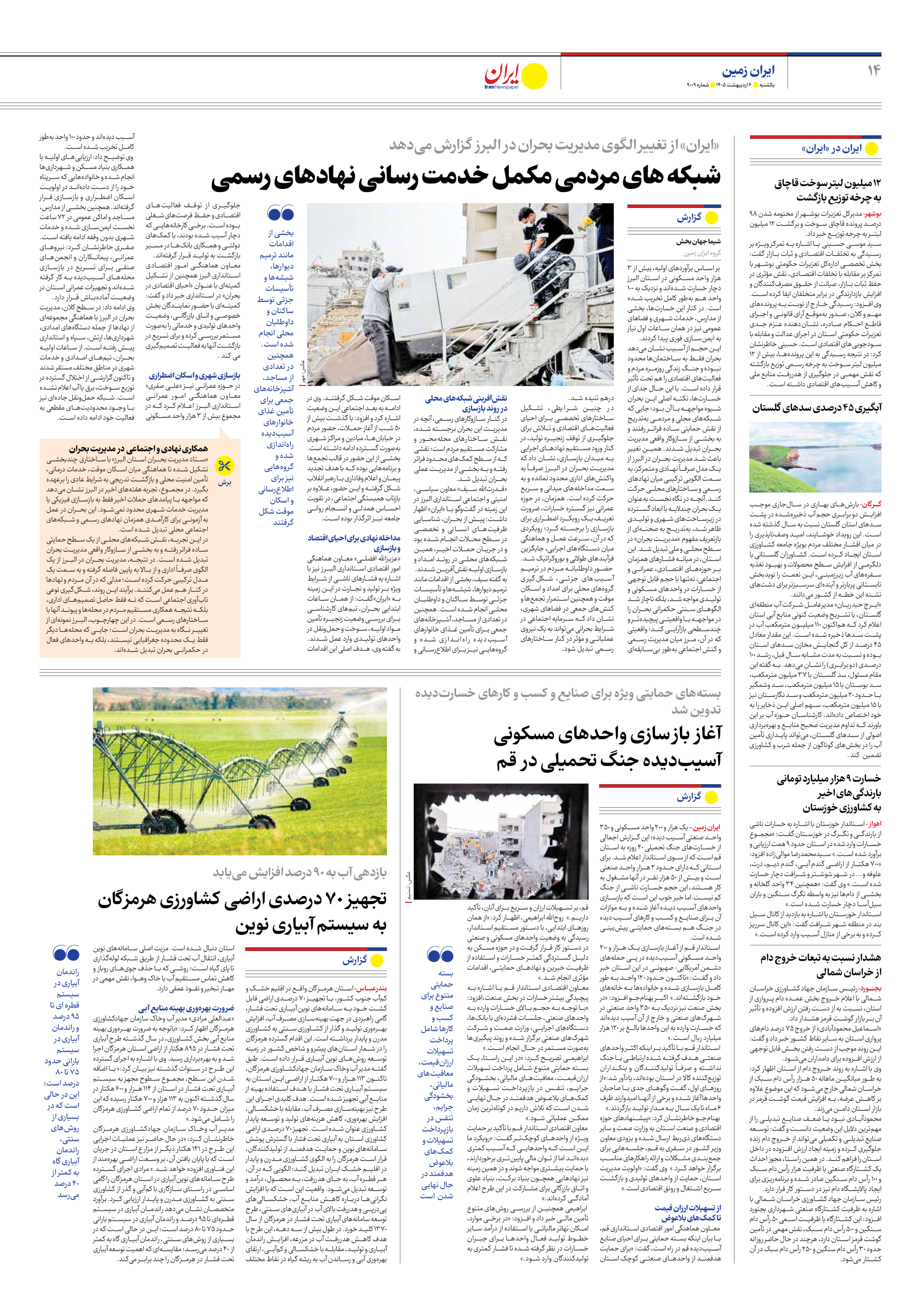 ایران زمین – یک هزار و 200 واحد مسکونی و 350 واحد صنعتی آسیب دیده؛ این گزارش اجمالی از خسارتهای جنگ تحمیلی 40 روزه به استان قم است که از سوی استاندار اعلام شد. برای استانی که دارای حدود ۲ هزار واحد صنعتی است و بیش از ۵۰ هزار نفر در آنها مشغول به کار هستند، این حجم خسارت ناشی از جنگ کم نیست.اما خبر خوب این است که بازسازی واحدهای آسیب دیده آغاز شده و به موازات آن برای صنایع و کسب و کارهای آسیب دیده در جنگ هم بستههای حمایتی پیشبینی شده است.